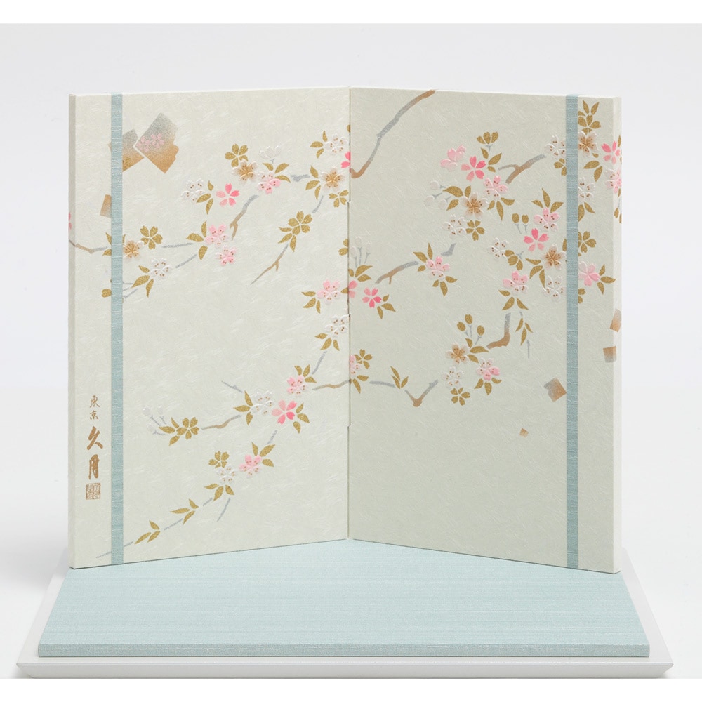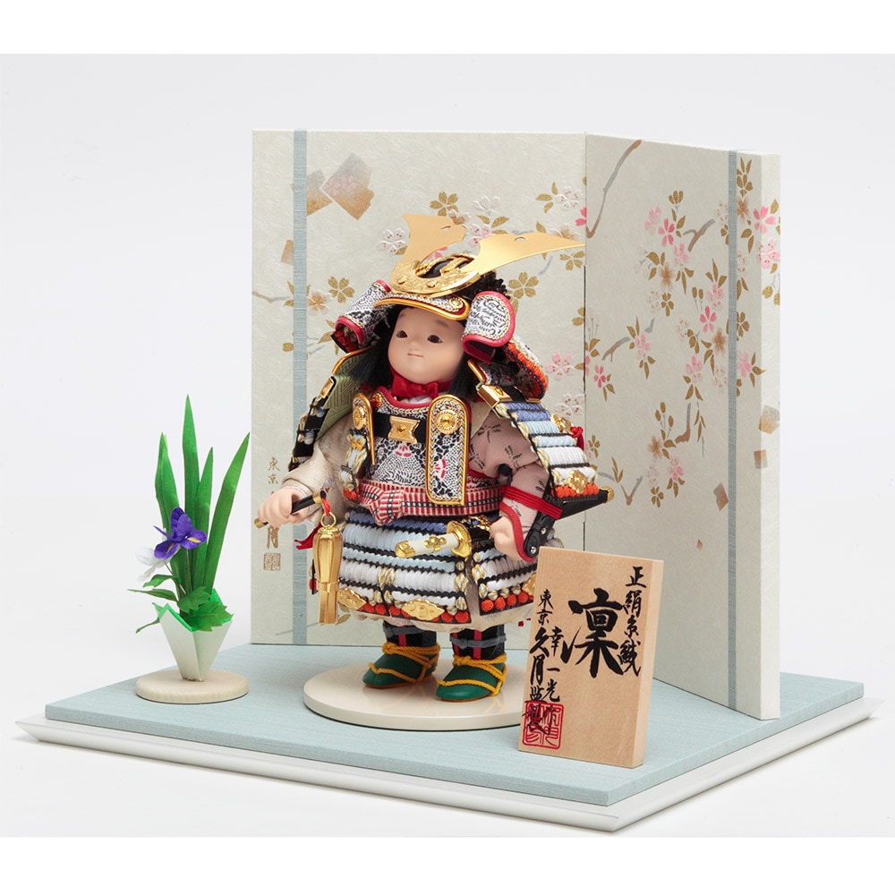 美しい桜を描いた明るい色彩の屏風に、凛々しくも可愛らしい鎧着姿のお人形が見事に映えます。