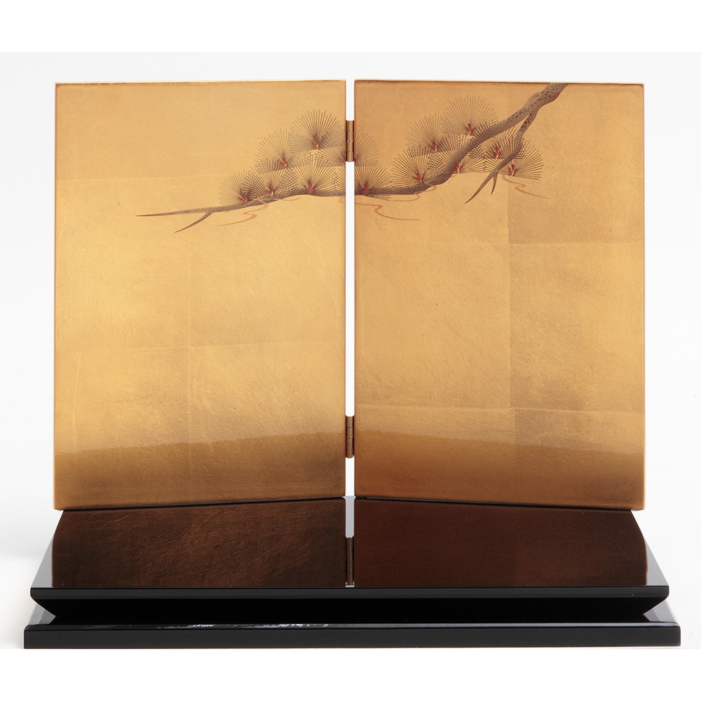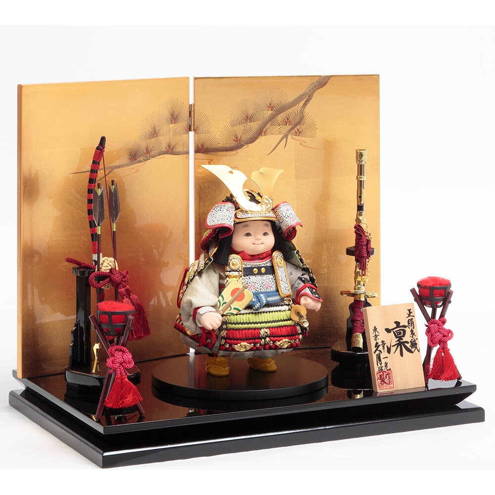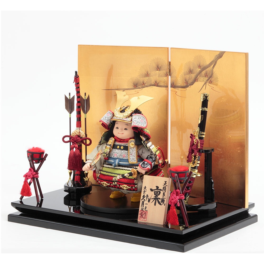 上品な松を描いた高級感のある金箔の屏風に、凛々しくも可愛らしい鎧着姿のお人形が見事に映えます。