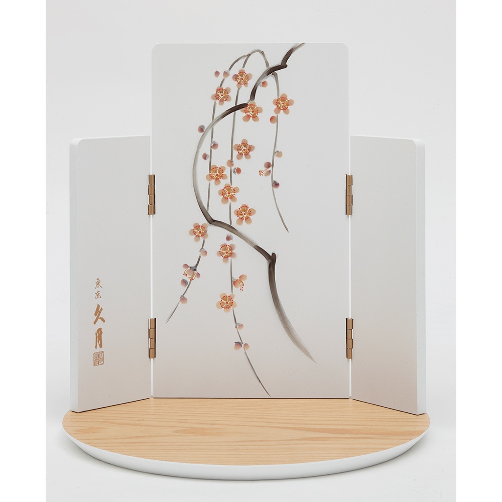 吹き返しに牡丹の飾り金具を配した美麗な兜が、梅を描いた風情のある屏風に見事に映えます。