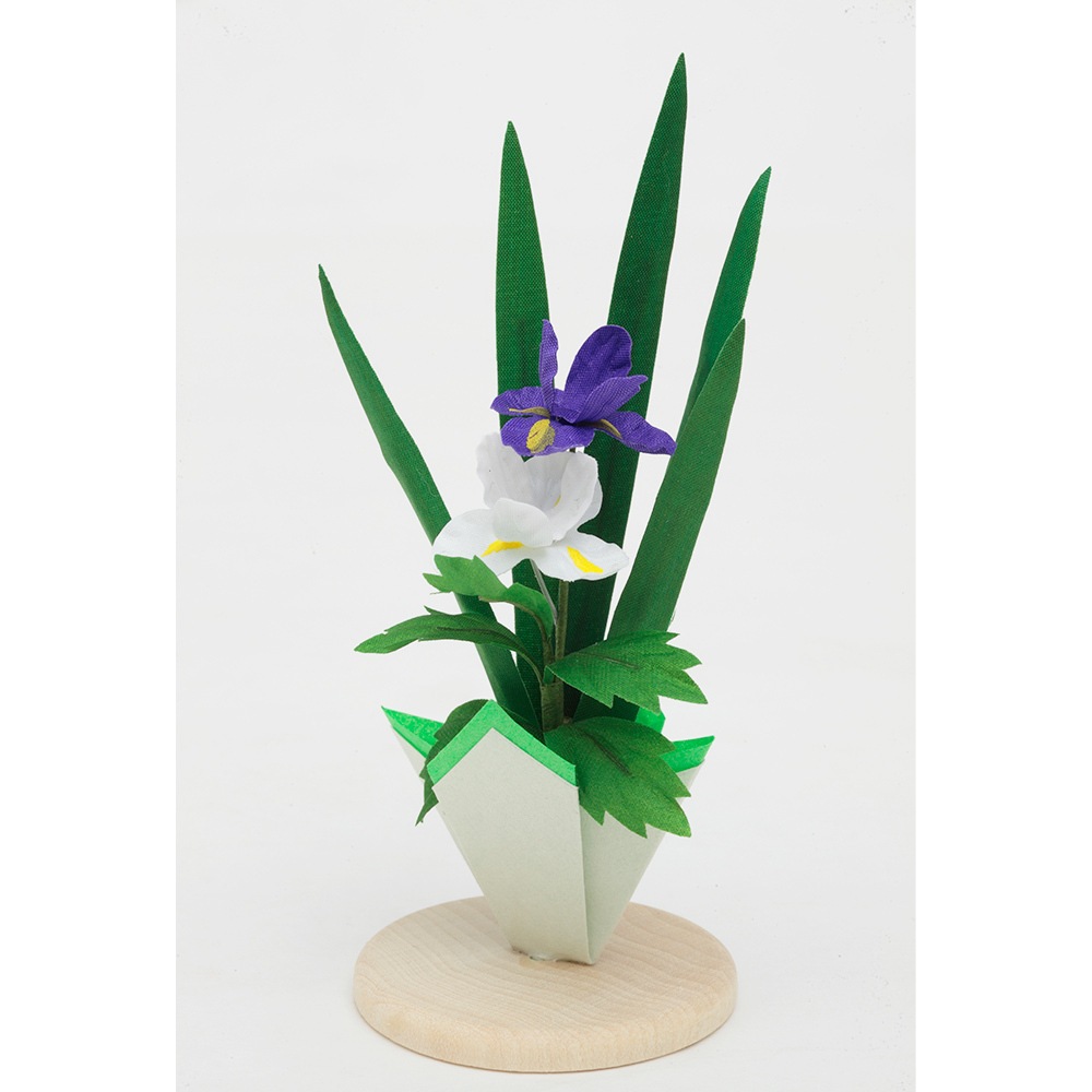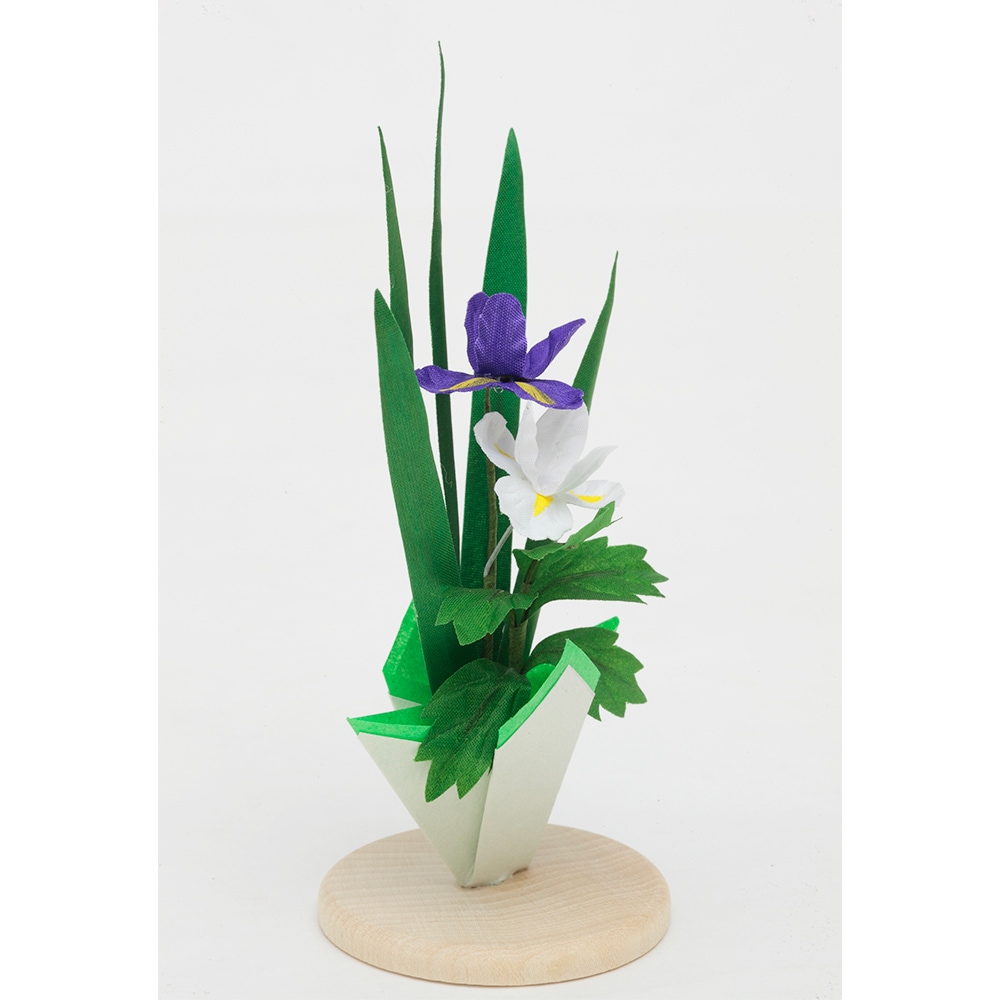優美な木肌が印象的なタモ材を使用した飾り台に、薬草の色である緑の袱紗と菖蒲飾りを合わせた、お祝いに相応しい縁起の良いデザインも素敵な人気のお飾りです。