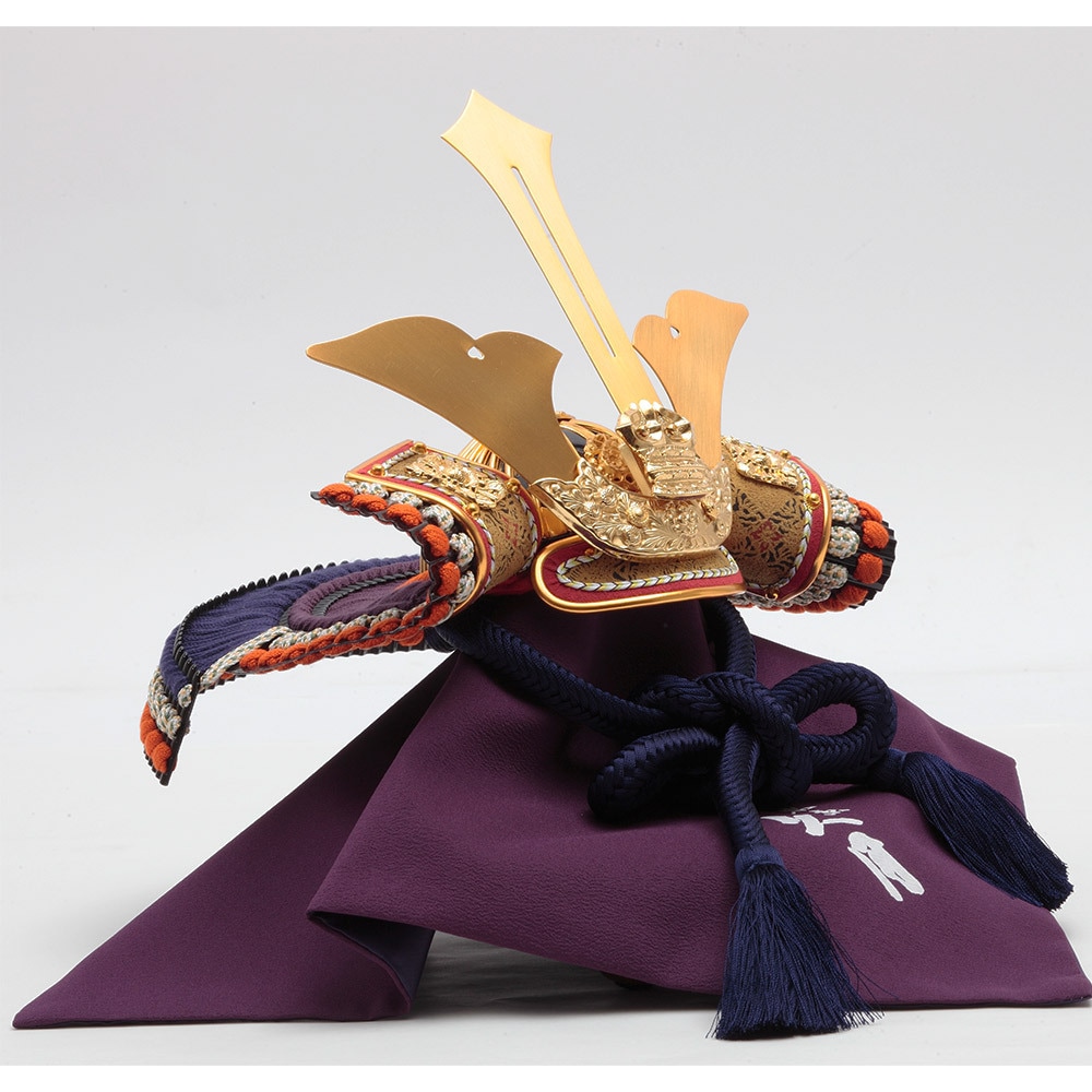 上品な正絹の色々縅(いろいろおどし)で仕上げた勇壮な三ツ鍬形の兜が、陣幕をイメージした趣のある背景に美しく映えます。