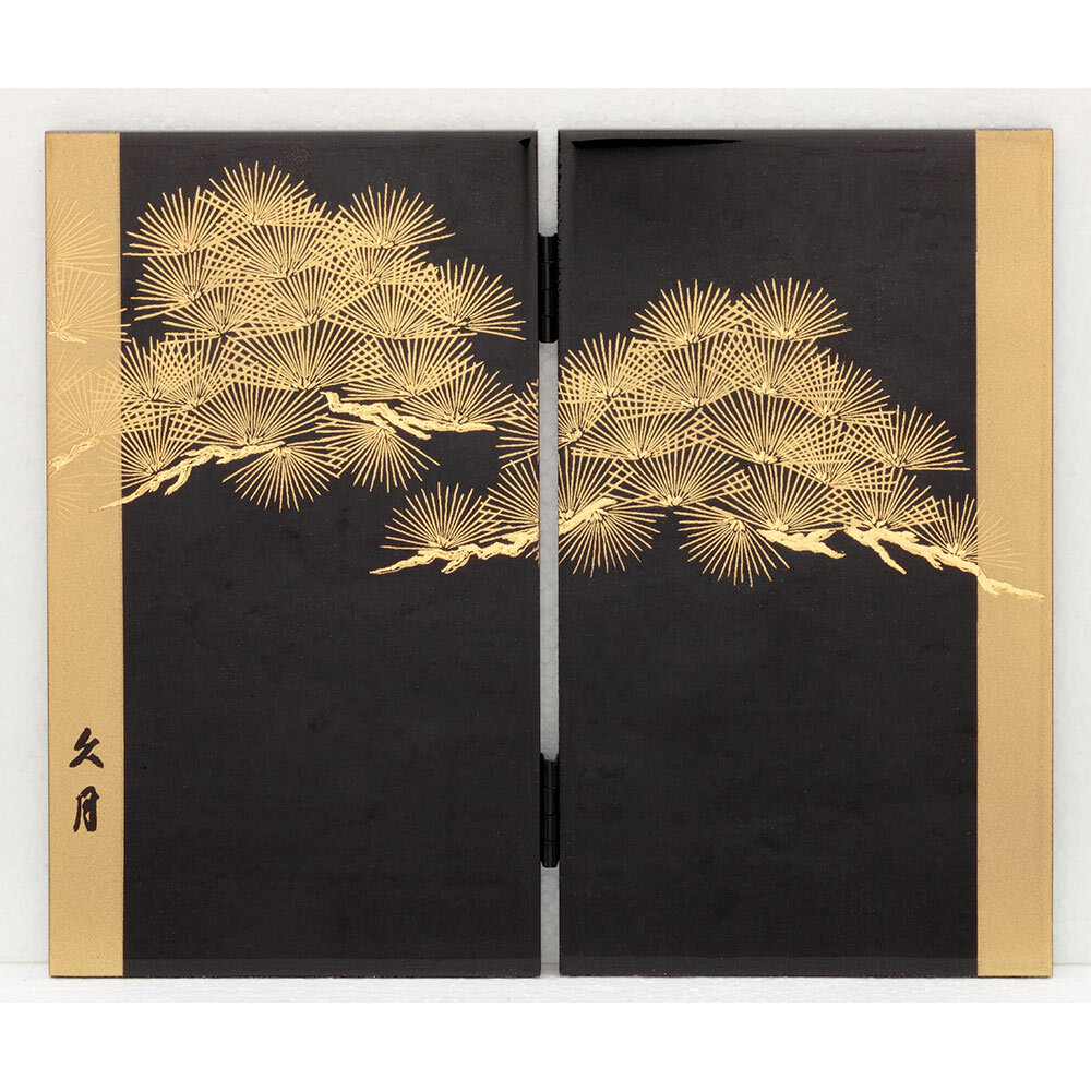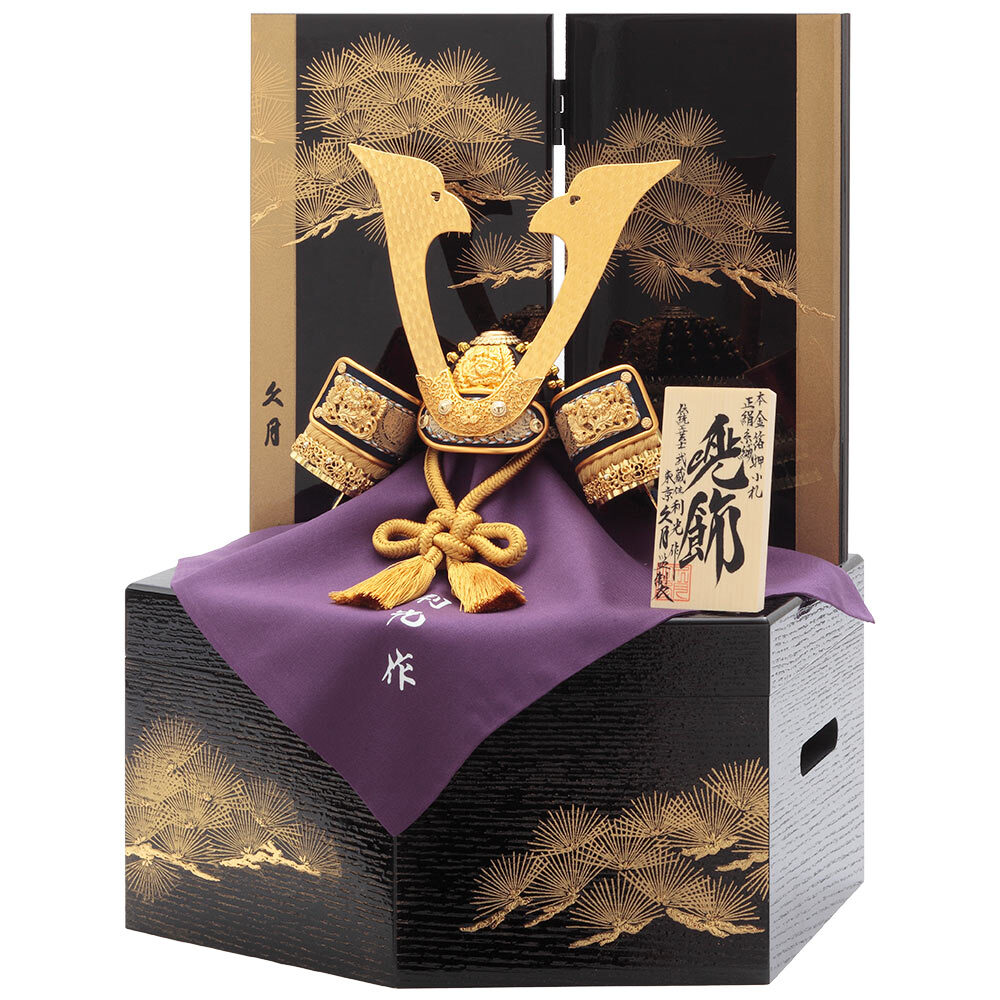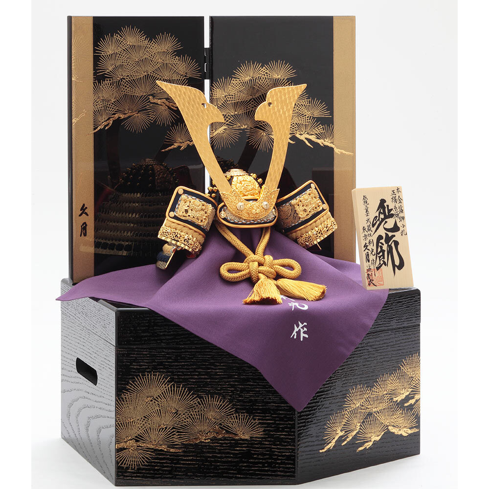 美しい松を描いた高級感のある飾り台と屏風に、伝統工芸士・鈴木利光が丁寧に手作業で仕立てた煌びやかな兜が見事に映えます。