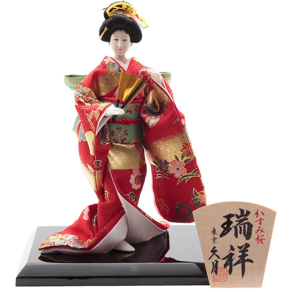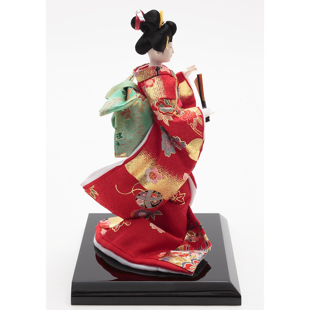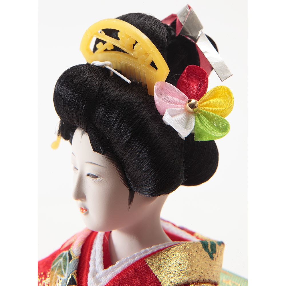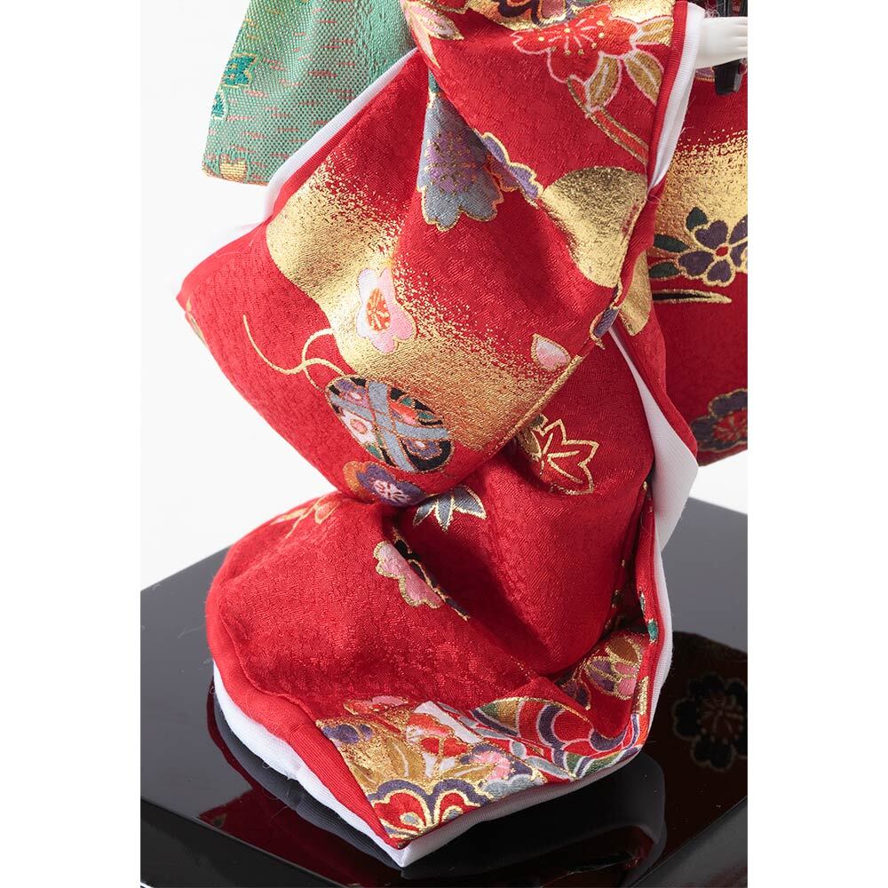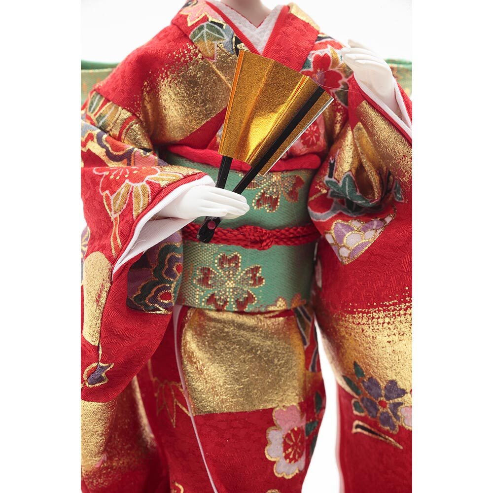 鮮やかな赤色に桜の柄が上品にあしらわれた衣裳と緑色の帯の対比が美しい尾山人形です。