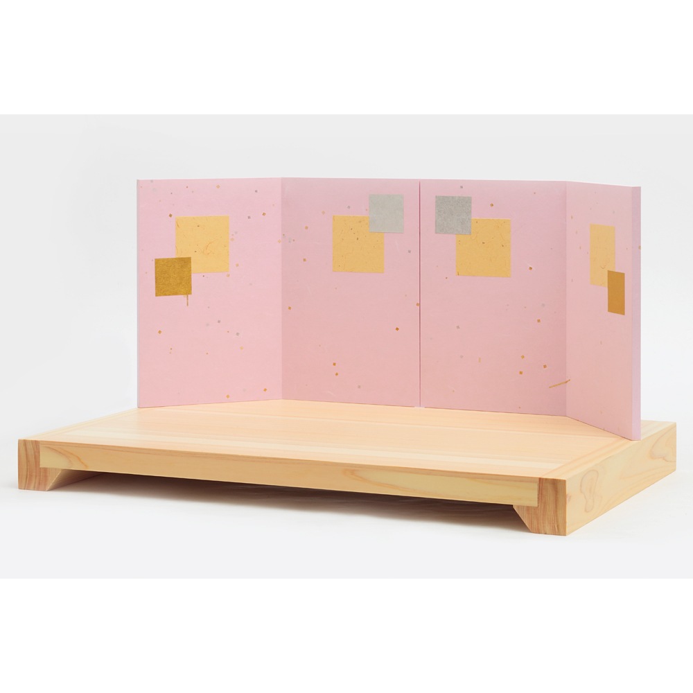 和紙貼りのモダンなデザインの屏風は人形の魅力をいっそう引き立てます。
