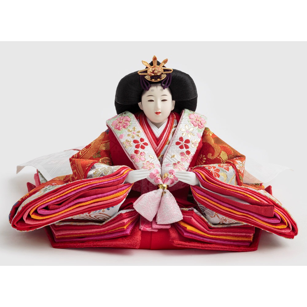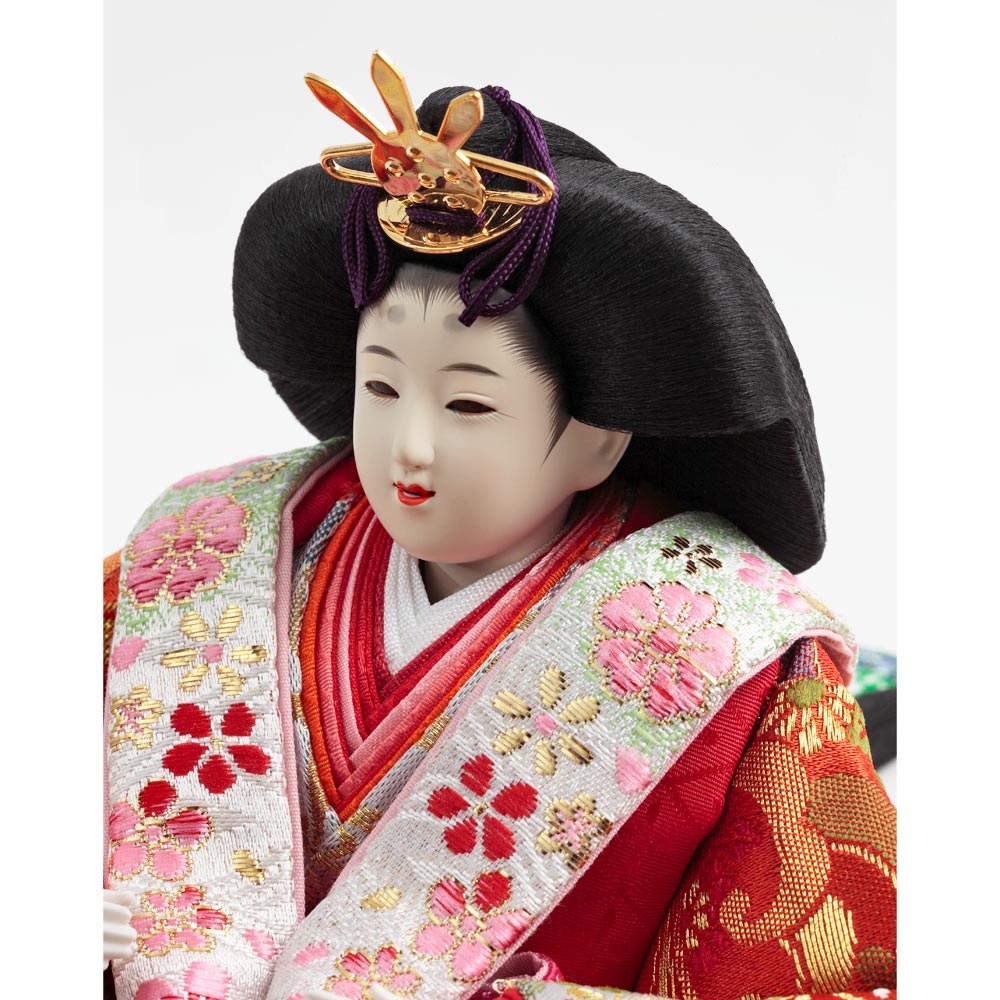 可愛らしく佇むお人形が晴れの日のお祝いを華やかに彩る、全体を明るい色合いでコーディネートした人気のおひなさまです。