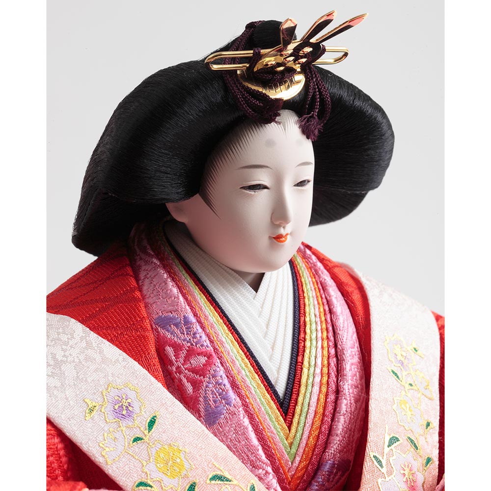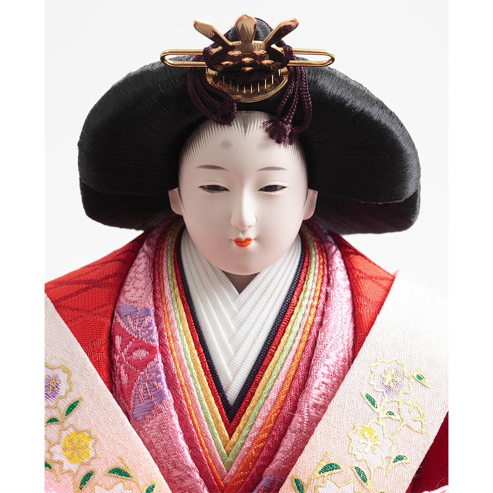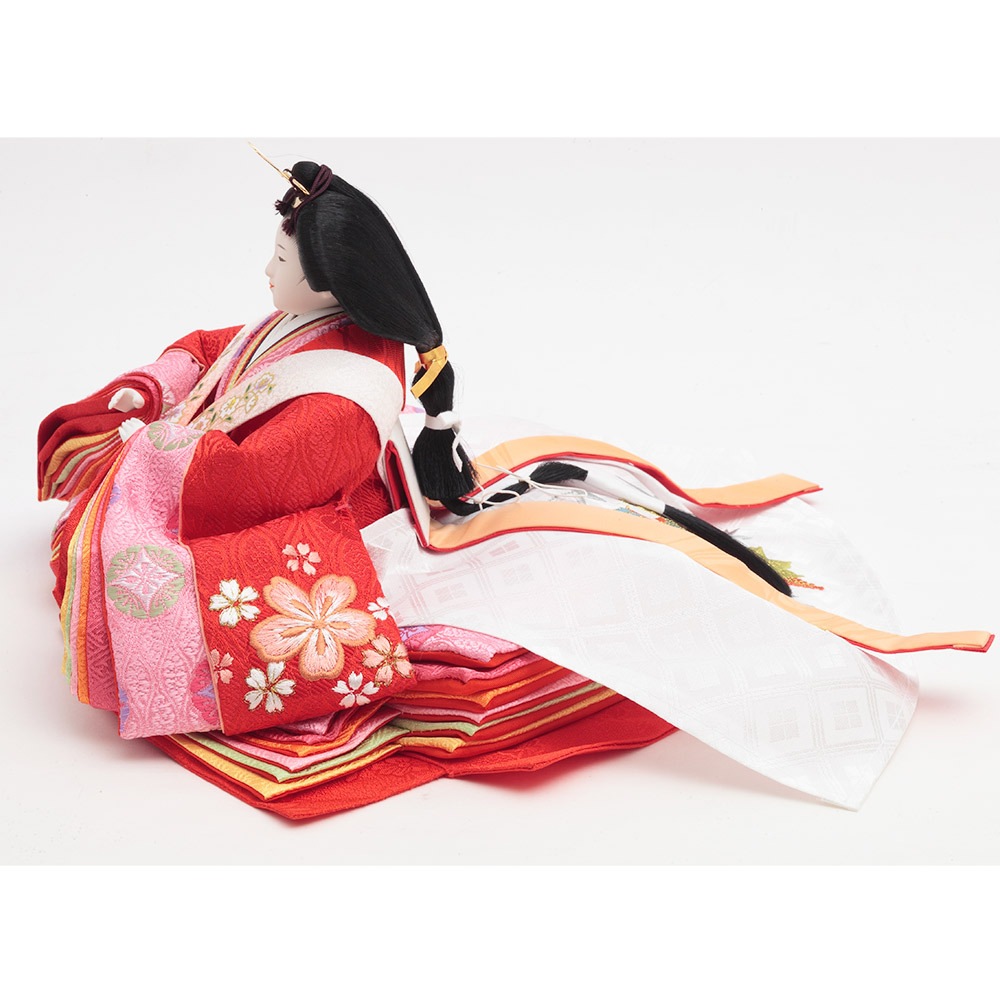 お衣裳には満開の花が麗々しく刺繍されており、おひなさま全体が春爛漫の様子を演出しております。