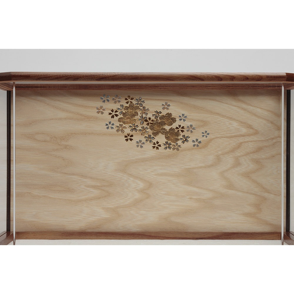 美しい木肌が印象的なケース背景には煌びやかな桜の絵柄をあしらい、桜橘の代わりに配した上品な花飾りと合わせて、飽きの来ない優雅な雰囲気を演出しました。