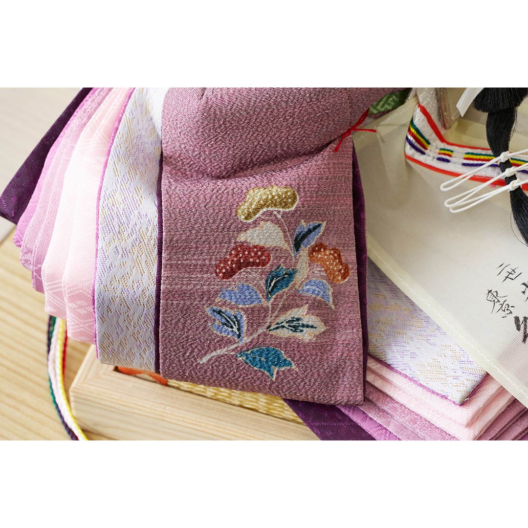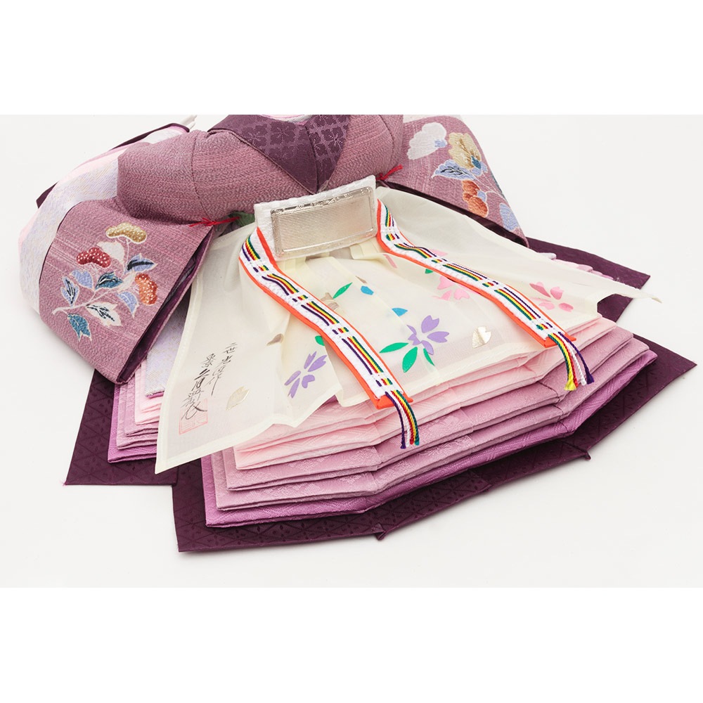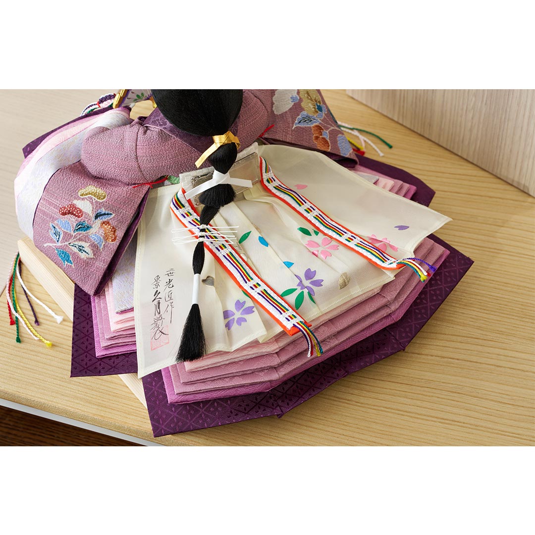 二世光匠作のお人形は、衣裳の型崩れを防ぐため生地の裏側に和紙を貼る裏打ちの工程で、生地の風合いを最大限生かしながら通気性を保つ目的から袋状に和紙の四辺に糊を貼る、袋貼りと呼ばれる大変手間のかかる仕上げなのが特長です。