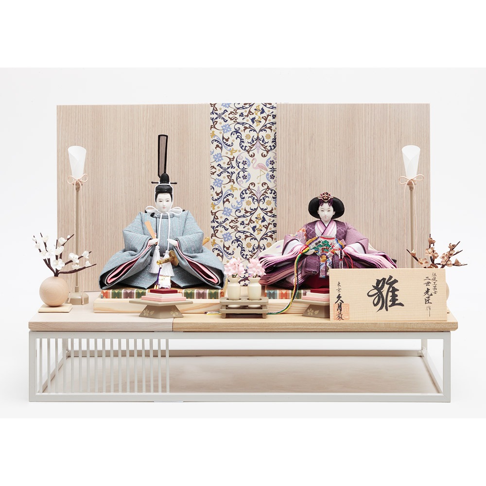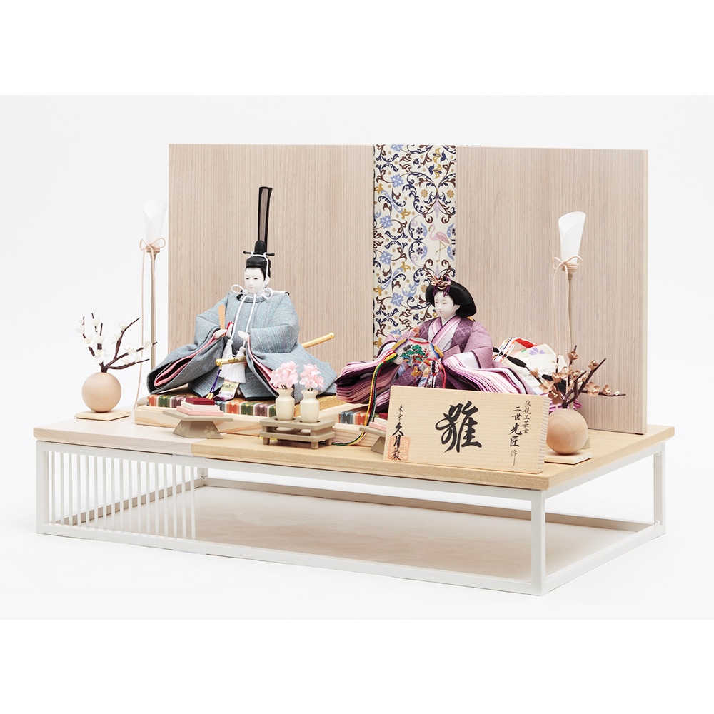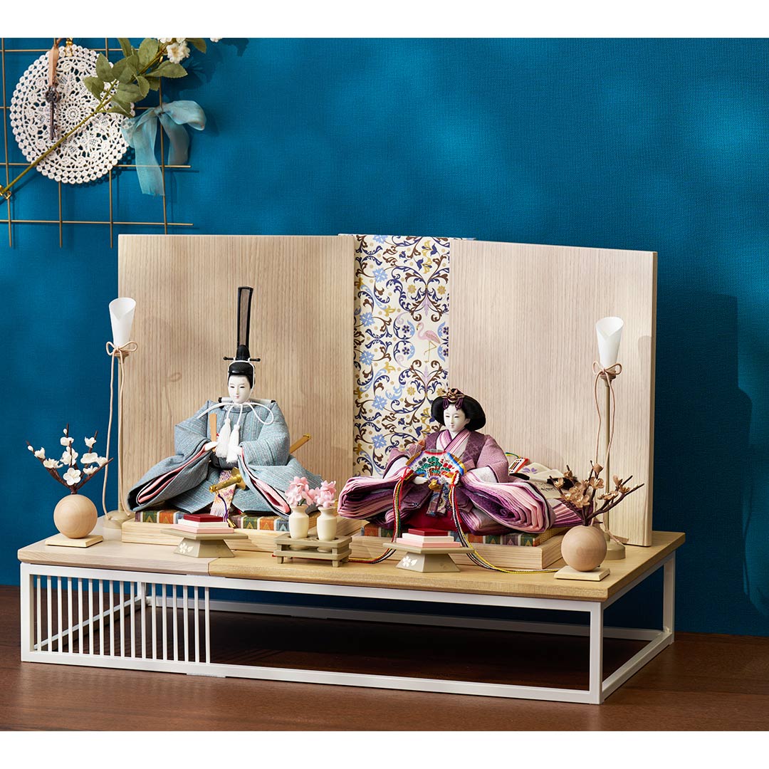 現代的でナチュラルなテイストが魅力の格子仕立ての飾り台に、明るく爽やかな色彩のお人形が見事にマッチします。