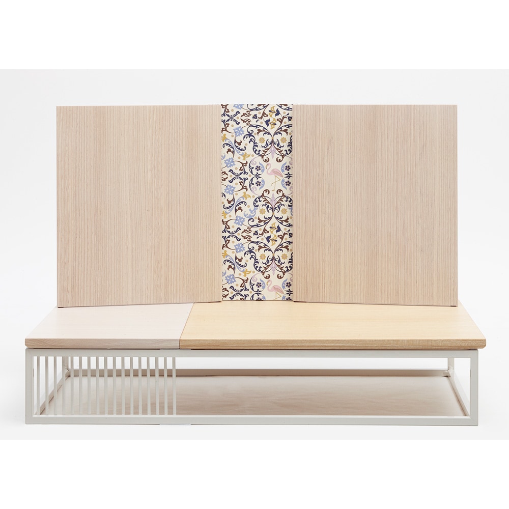 お人形を引き立てる木目調の屏風には、永遠の意味を持つ唐草文様と幸福を意味するフラミンゴを描き、晴れの日のお祝いに相応しい縁起の良いデザインとしました。