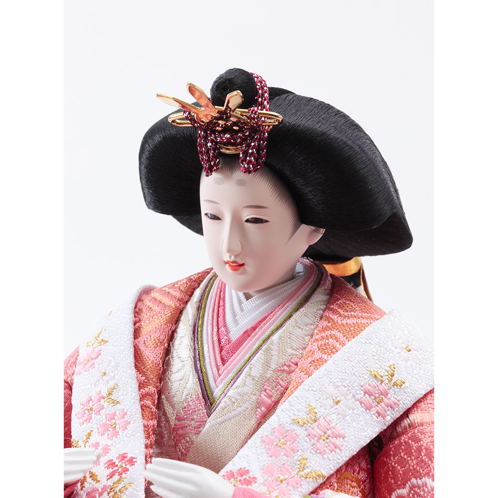 春らしい桜の絵柄をあしらった趣のある色合いが印象的な飾り台に、優し気に微笑むお顔立ちが素敵なお人形が見事に調和します。