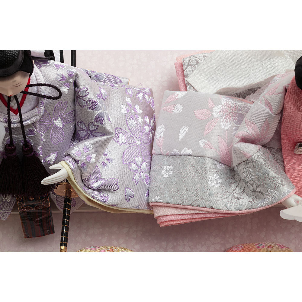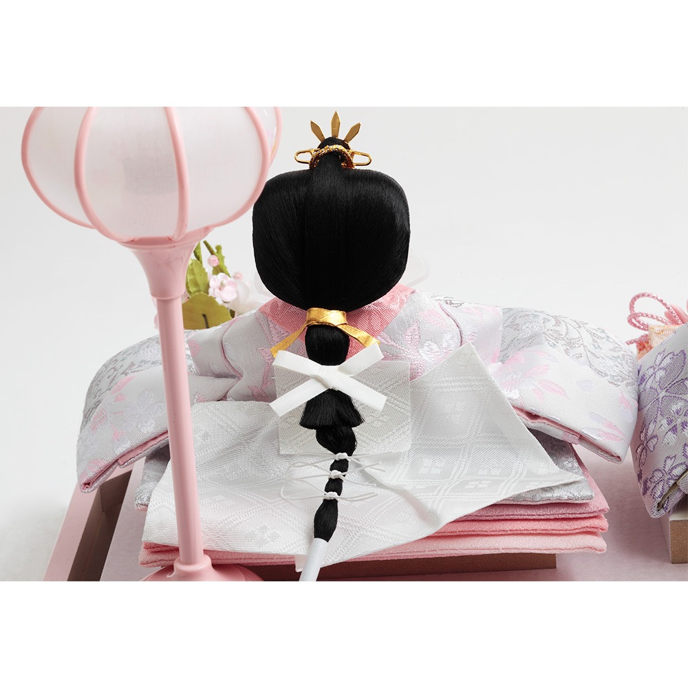 お人形が手に持つ笏(しゃく)や扇の明るくモダンなデザインも素敵で、鮮やかな花飾りや可愛らしいお道具など、女の子のお祝いに相応しい可愛らしいテイストが魅力です。