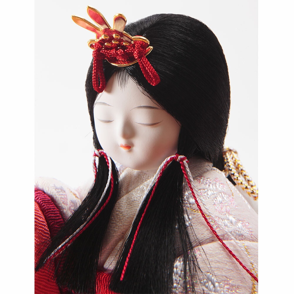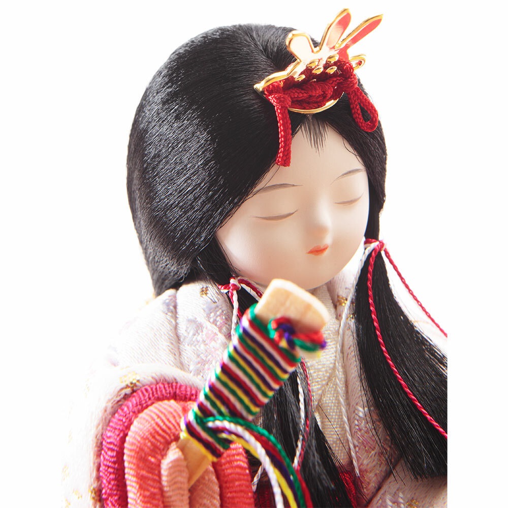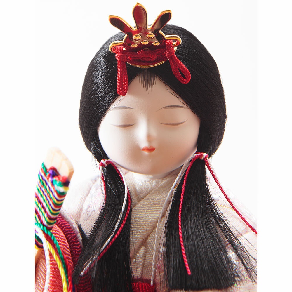 優美に微笑むお人形のお顔立ちは、筆を使用して丁寧に表現する笹目(ささめ)と呼ばれる目の書き方が魅力で、薄墨を何層にも重ねて書かれた奥行のある目は、純真で愛らしい表情を生み出しています。