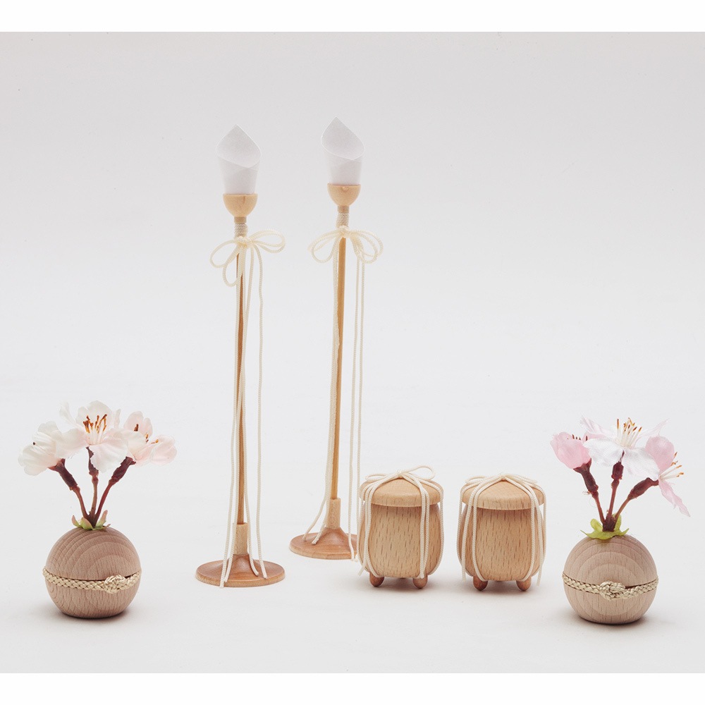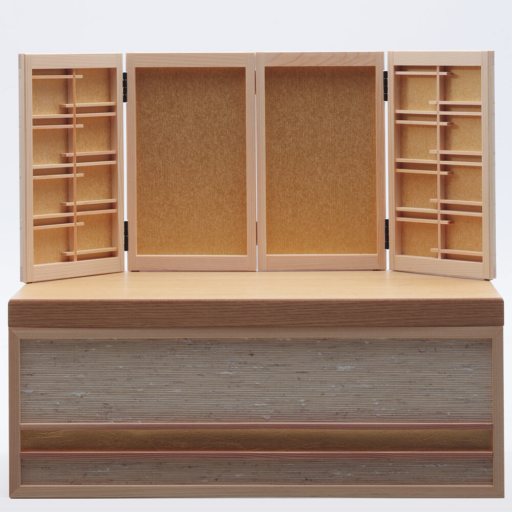 美しい木肌が素敵な飾り台は、お人形やお道具類の収納ボックスを兼ねており、省スペースに仕舞える点も特長です。