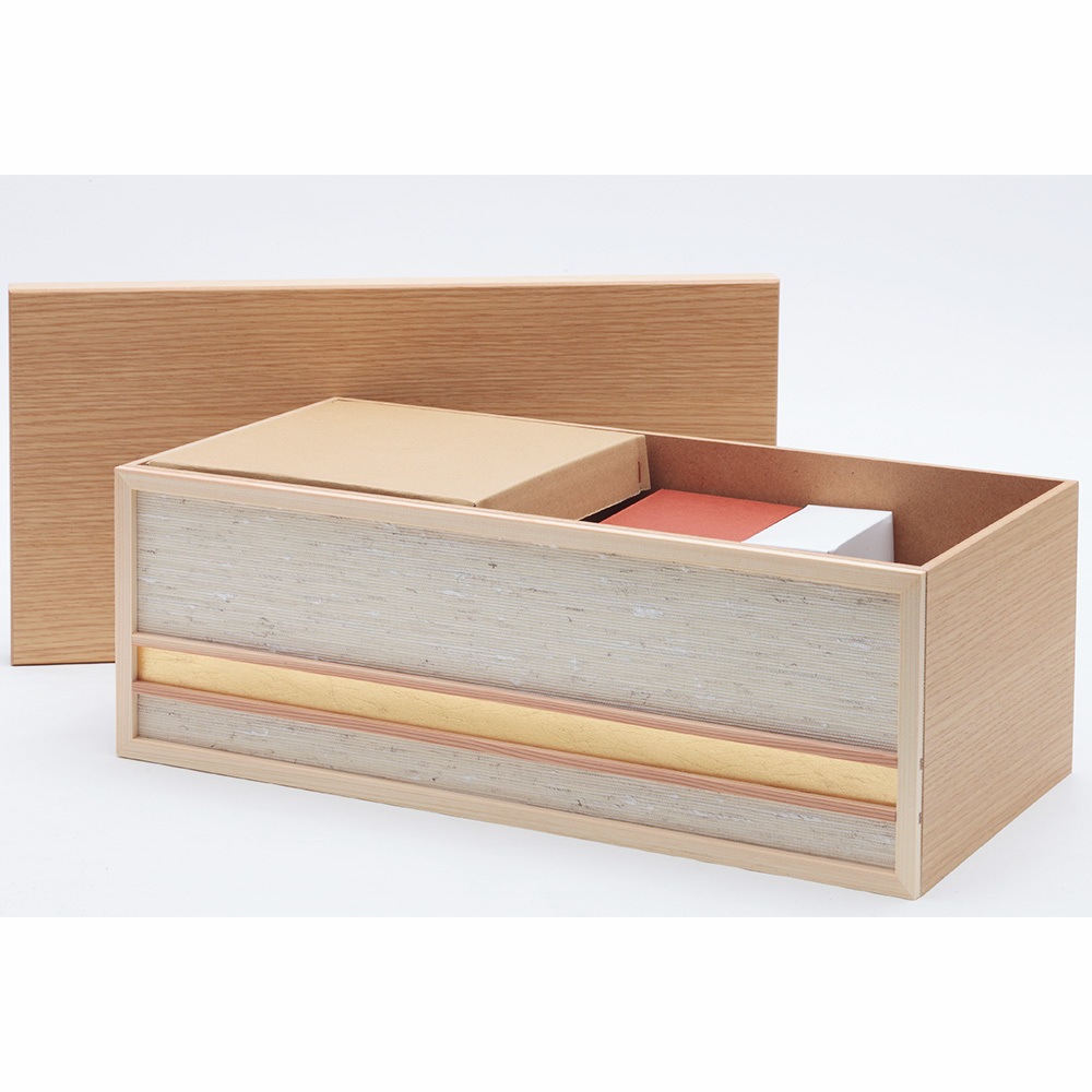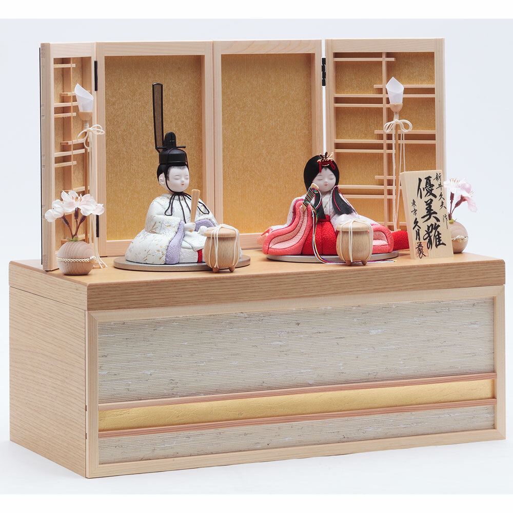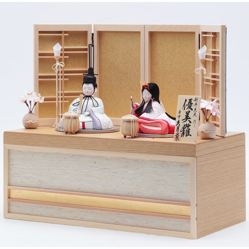 伝統工芸士・新井久夫が丁寧に手作業で仕立てた、優し気で上品な佇まいに魅せられる収納タイプの親王飾りです。