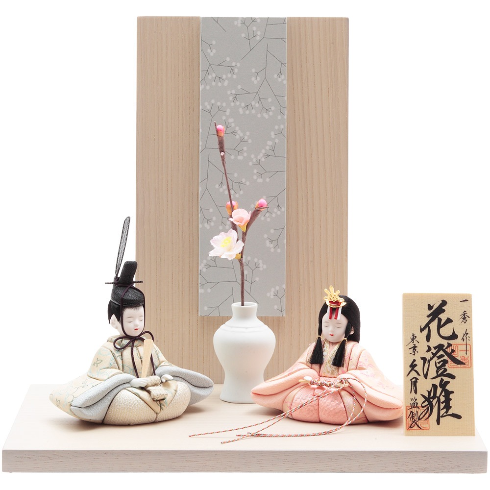 美しい木肌が印象的な木目調の飾り台と屏風に、春らしい明るく柔らかな色彩のお人形が見事に調和します。