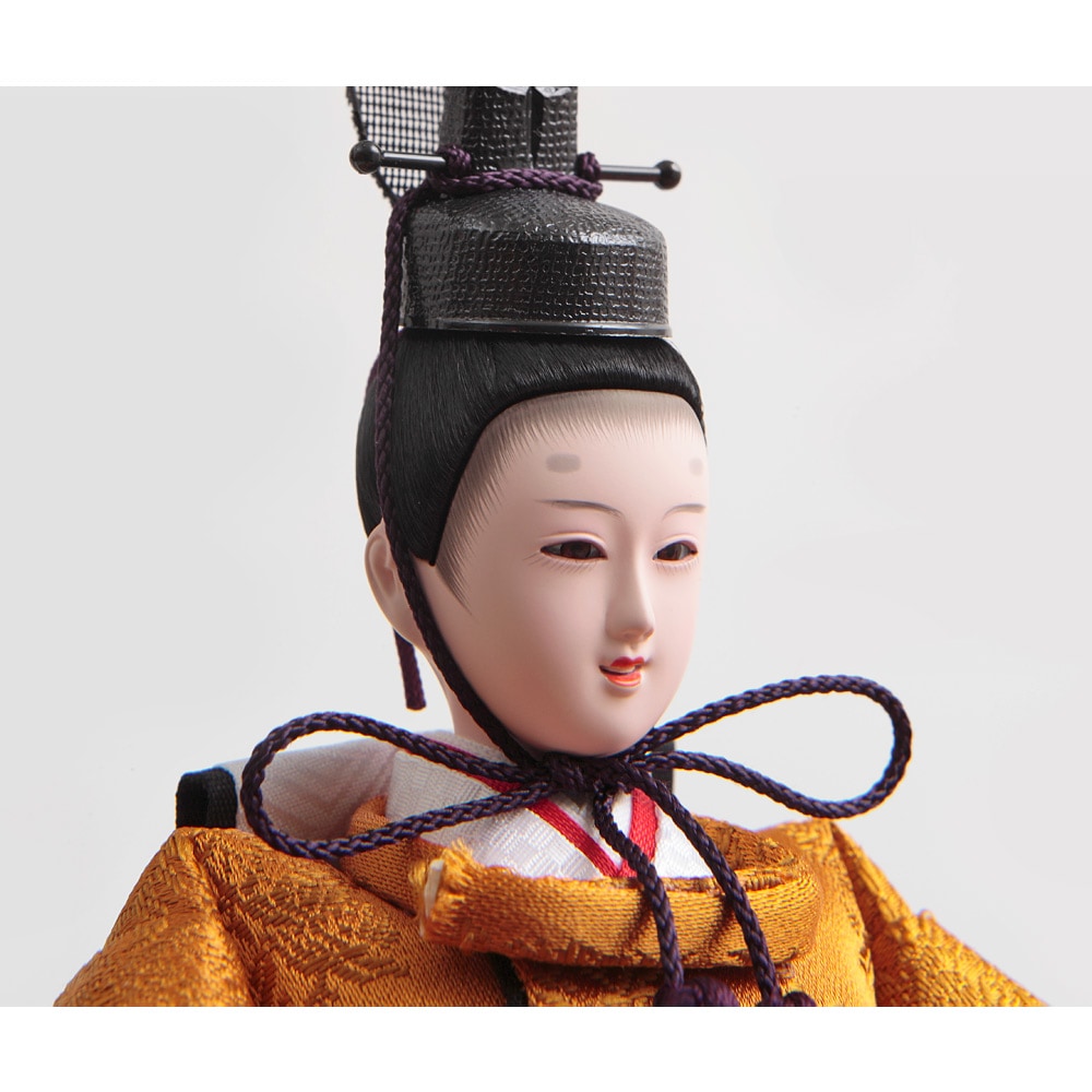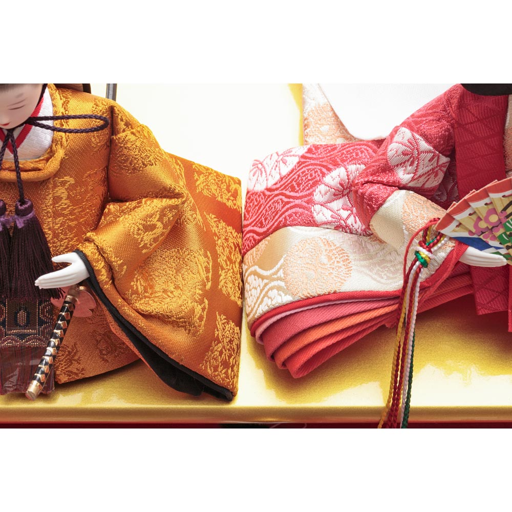 平安装束の中でも格式の高さで知られる黄櫨染御袍(こうろせんのごほう)を再現した男雛と、魔除けの意味を持つ赤を基調とした女雛が、クラシカルな雰囲気の金色のケース背景に見事に映えます。