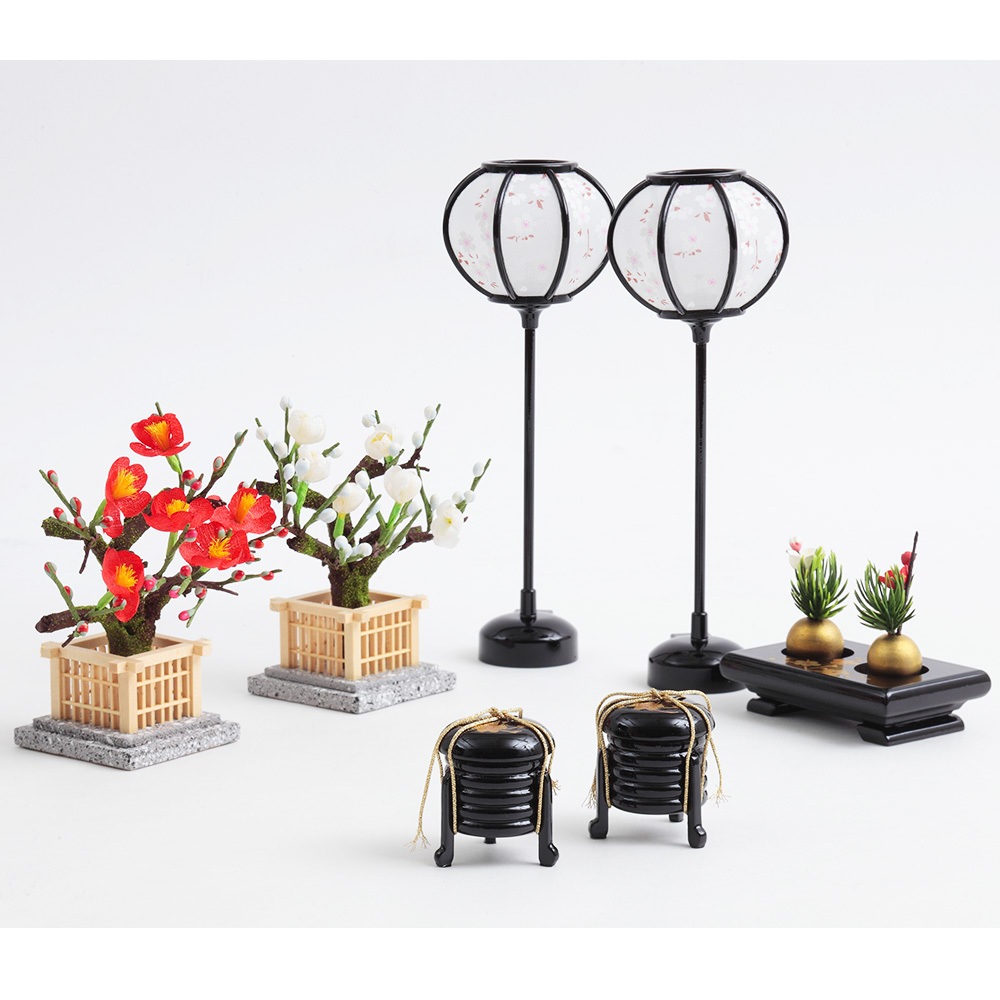美しい紅白梅と趣のあるお道具を合わせ、全体の統一感にもこだわって仕立てた人気のおひなさまです。