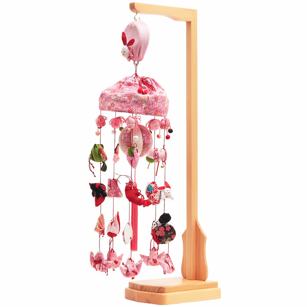 あたたかみのある色合いの木目調のスタンドに、上品なピンク色を基調としたつるし雛を合わせました。