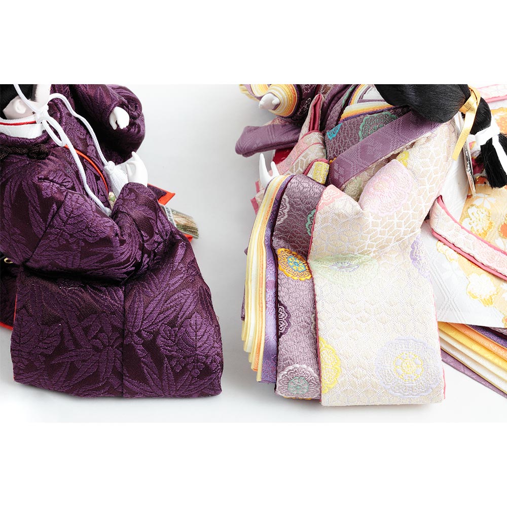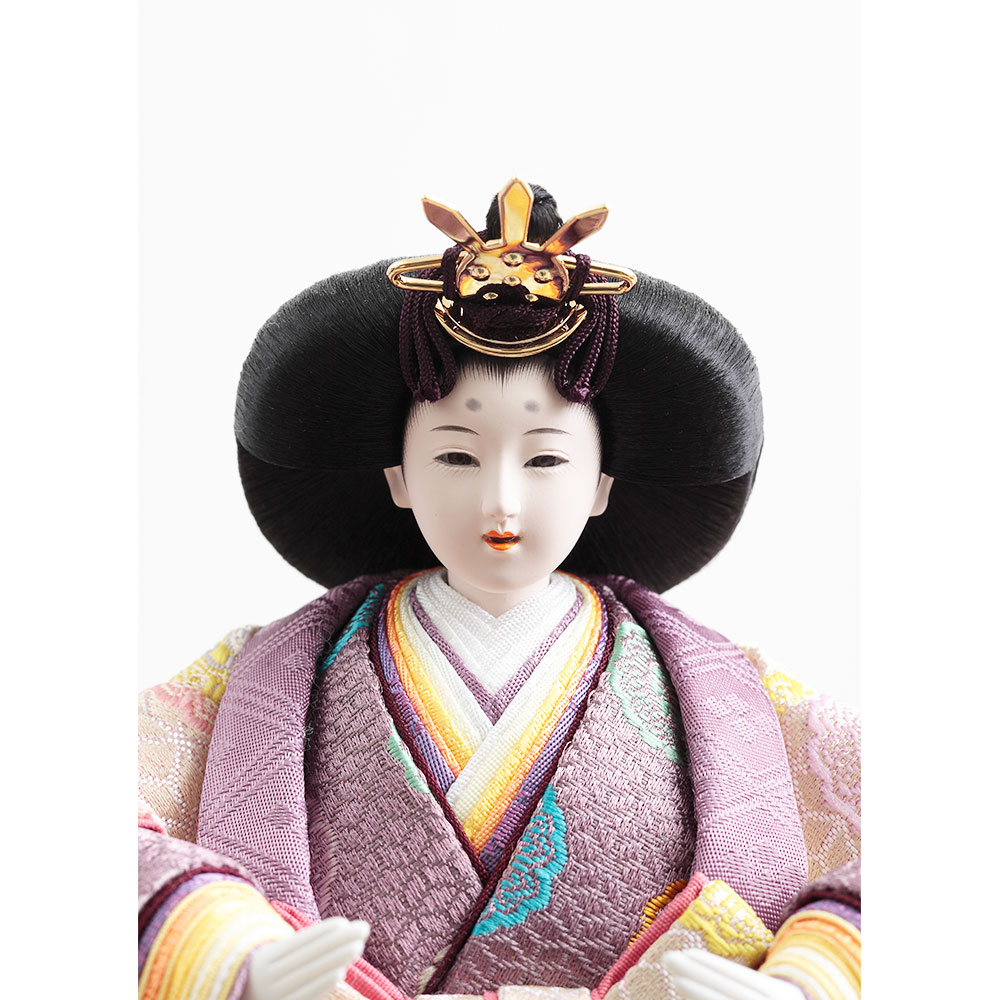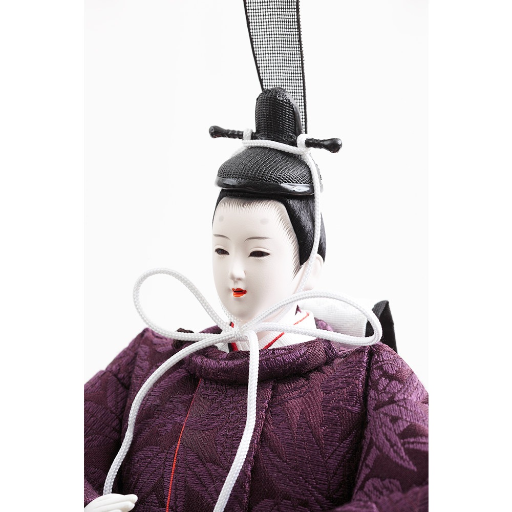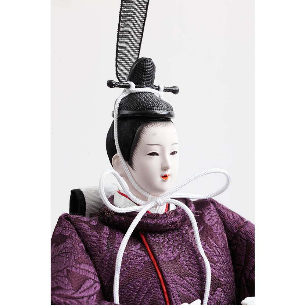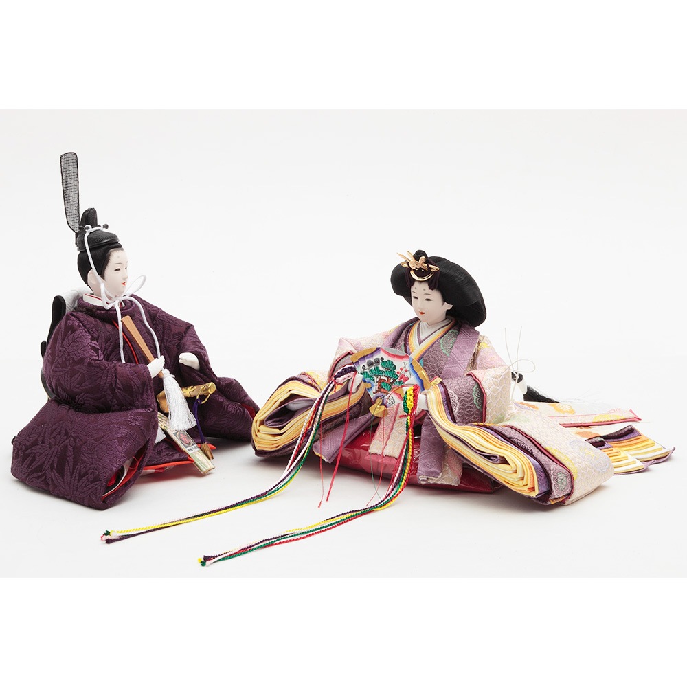 格子の装飾をあしらった上品な屏風を背景に、古来より高貴な色とされる紫を基調とした衣裳をまとった男雛と女雛が優し気に佇みます。