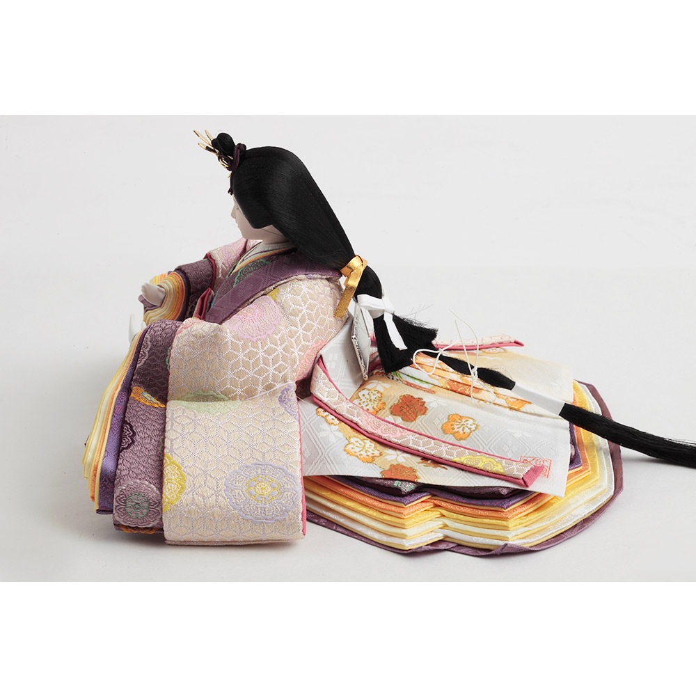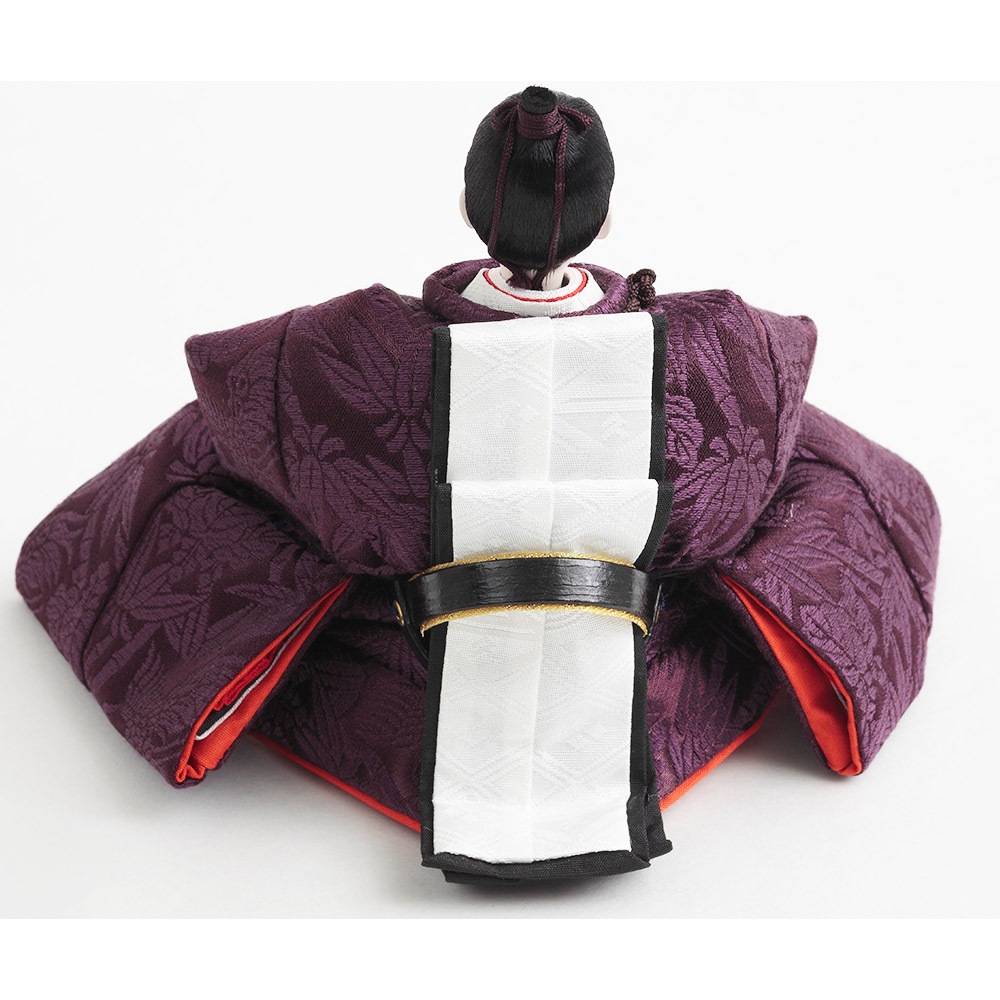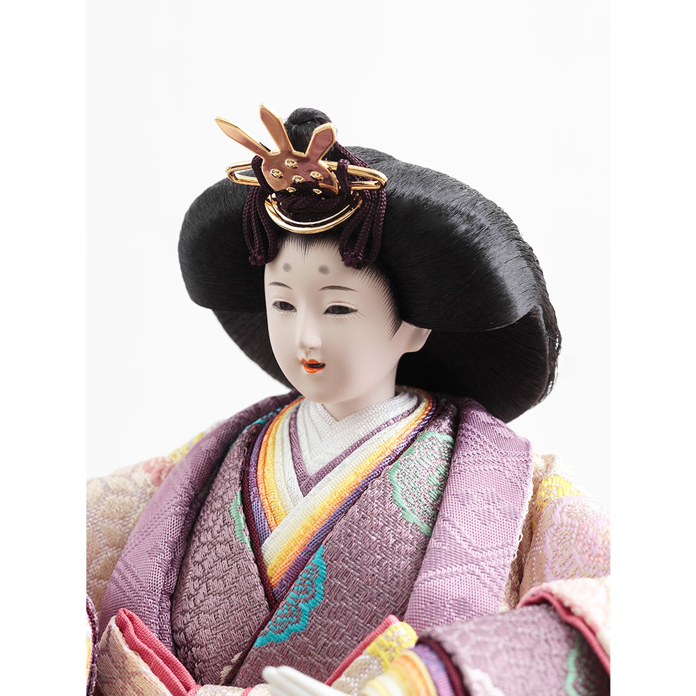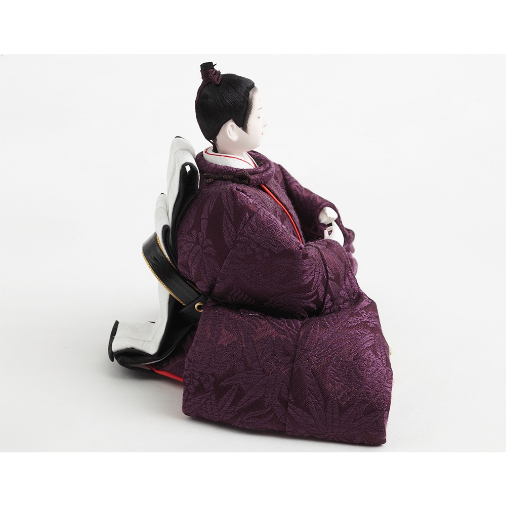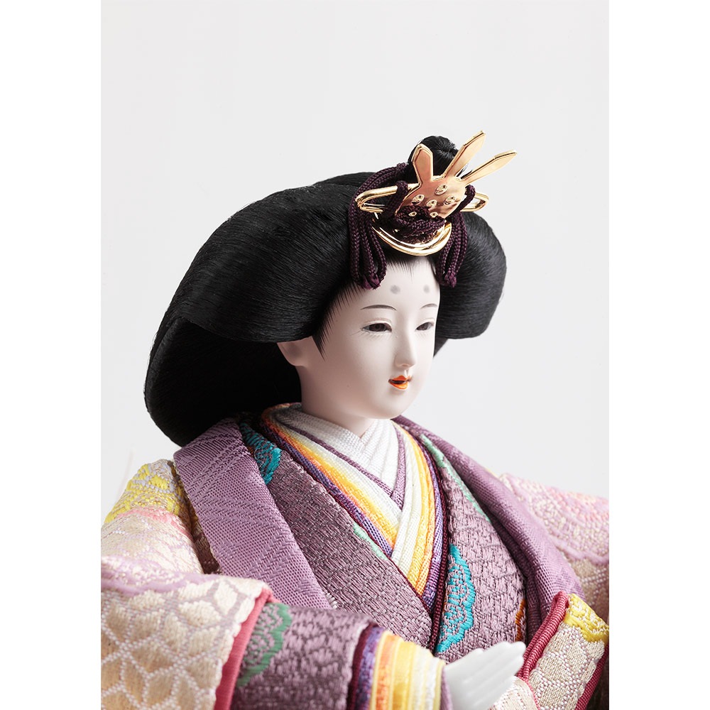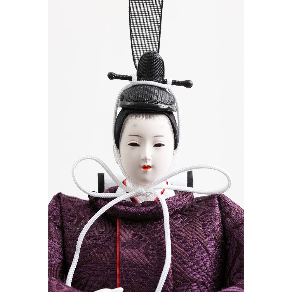 格子の装飾をあしらった上品な屏風を背景に、古来より高貴な色とされる紫を基調とした衣裳をまとった男雛と女雛が優し気に佇みます。