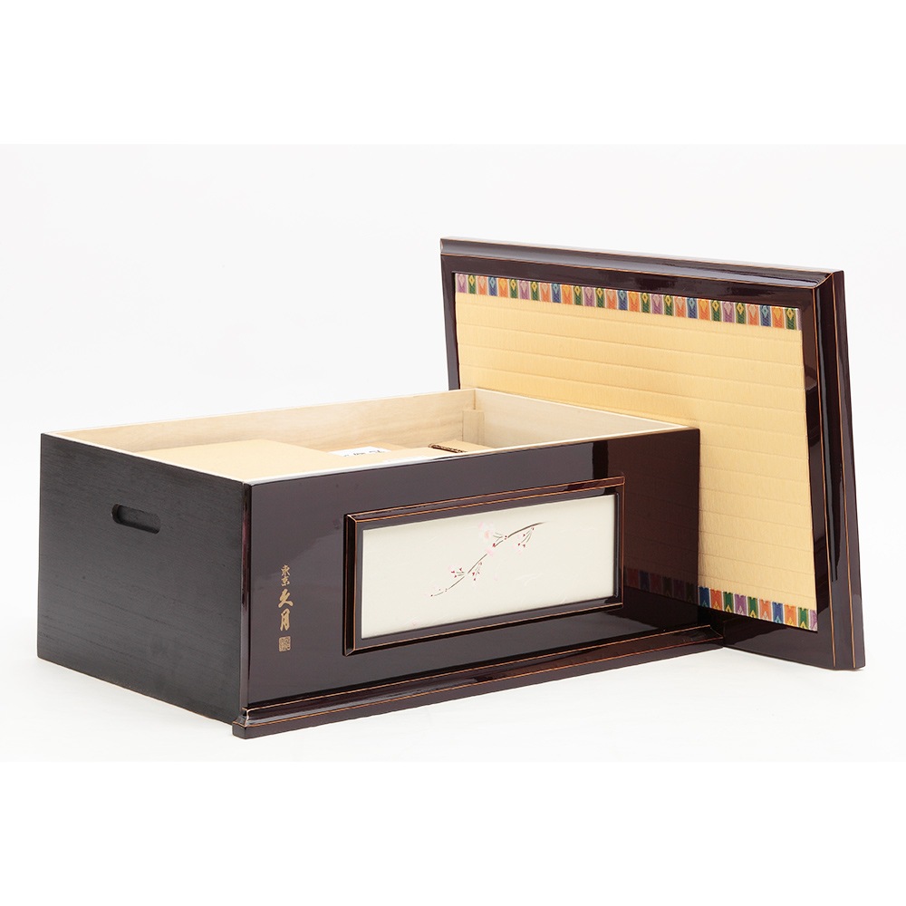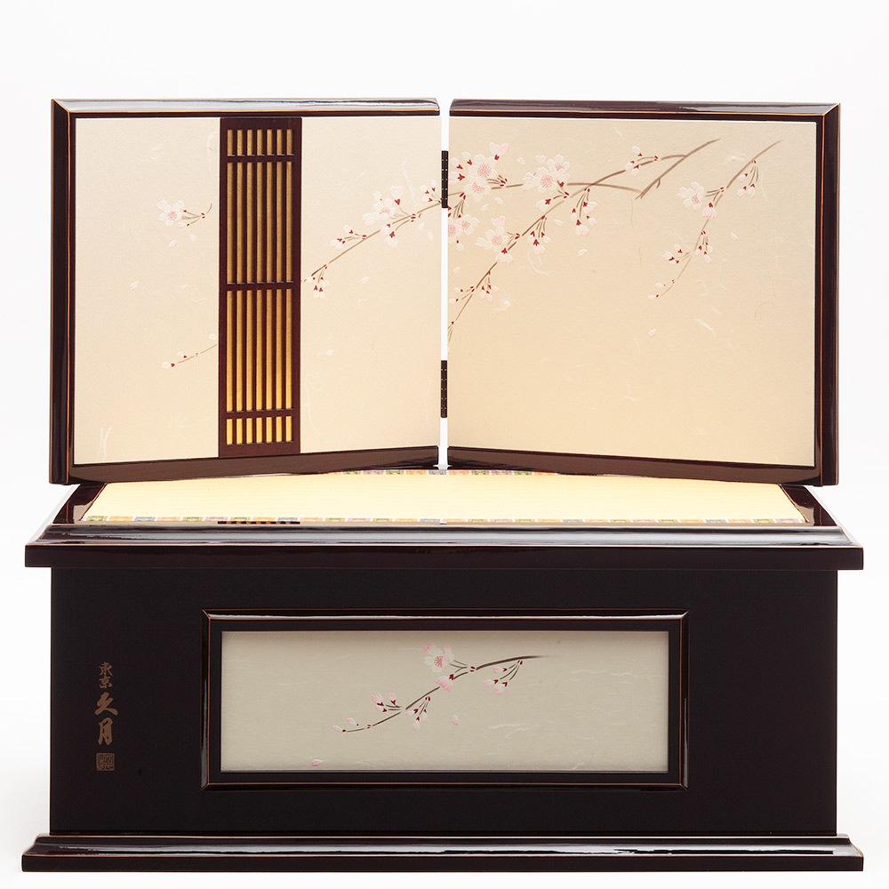 落ち着いたデザインが素敵な飾り台は、お人形やお道具類の収納ボックスを兼ねており、省スペースに仕舞える点も特長です。