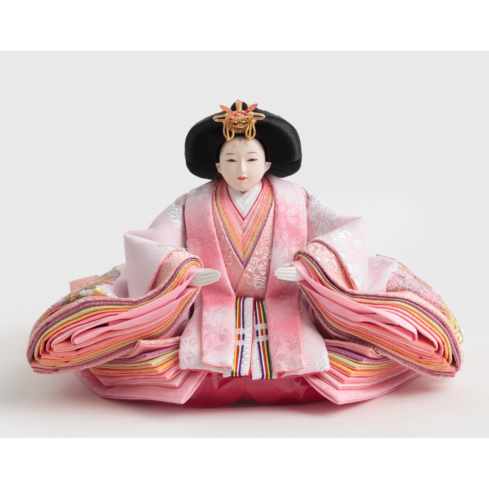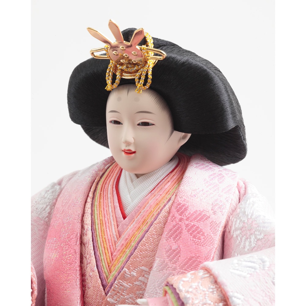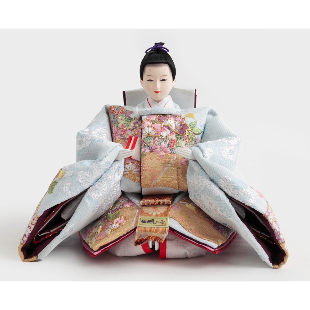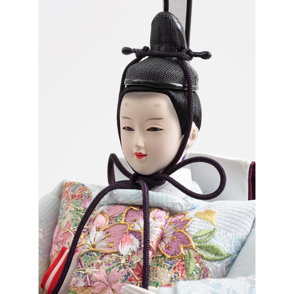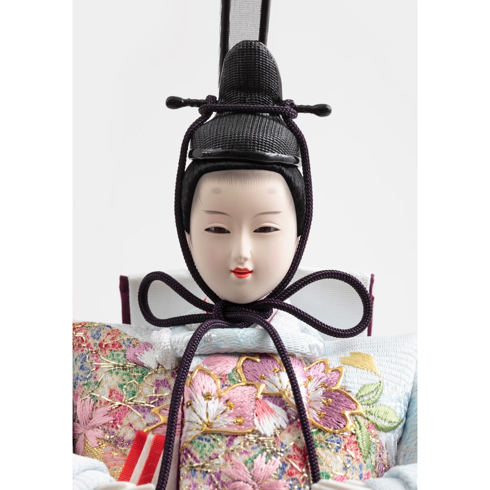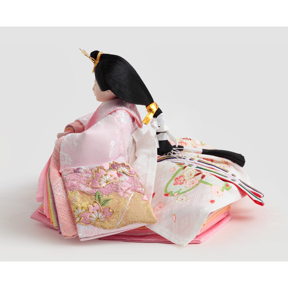 春らしい桜を刺繍で施した衣裳をまとった優し気に佇む上品なお人形が、鮮やかな赤色の毛氈と屏風に良く調和する、お祝いに相応しい縁起の良いデザインで全体をコーディネートした人気のお飾りです。