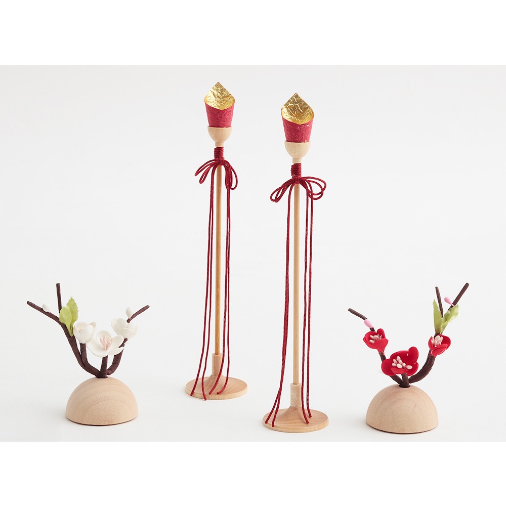 飾り台と色合いを合わせた雅やかな紅白梅に、縁起の良い熨斗飾りを添えた、春の晴れの日に相応しい風情のある仕立ても特長です。