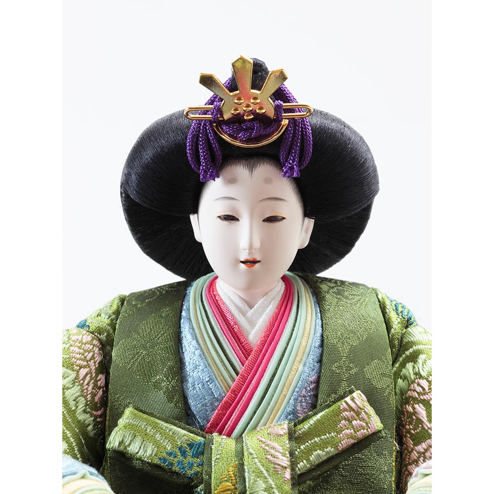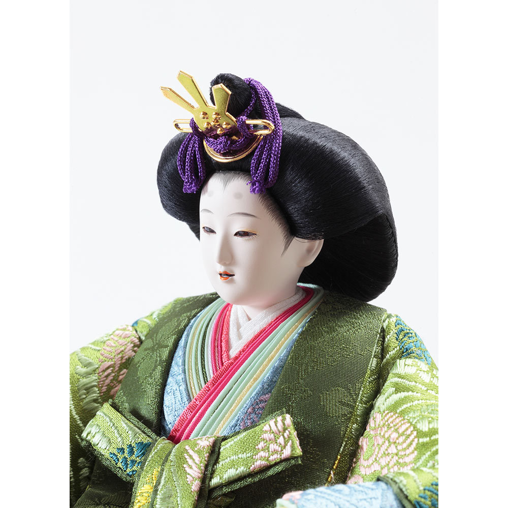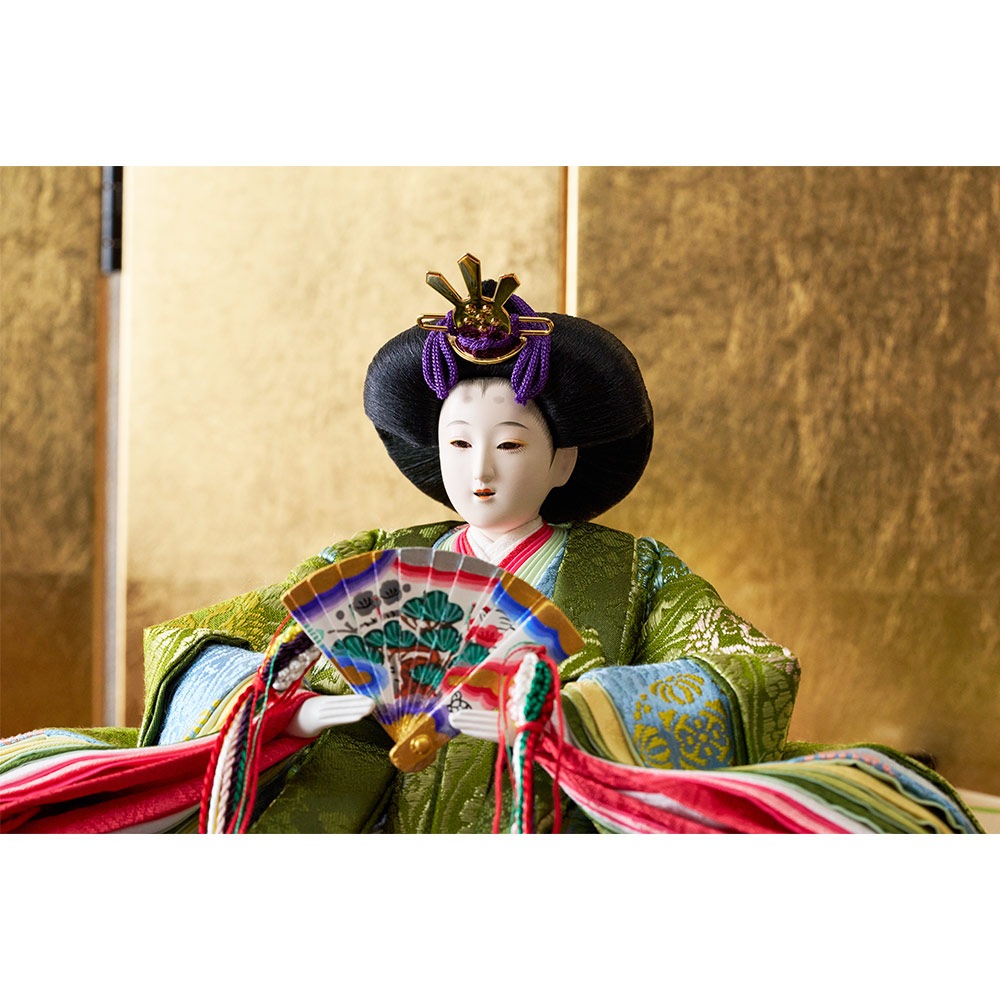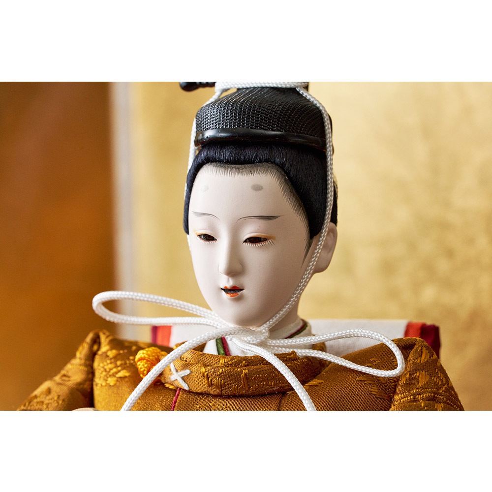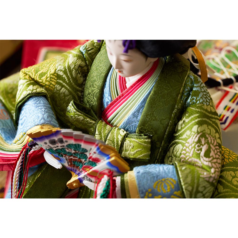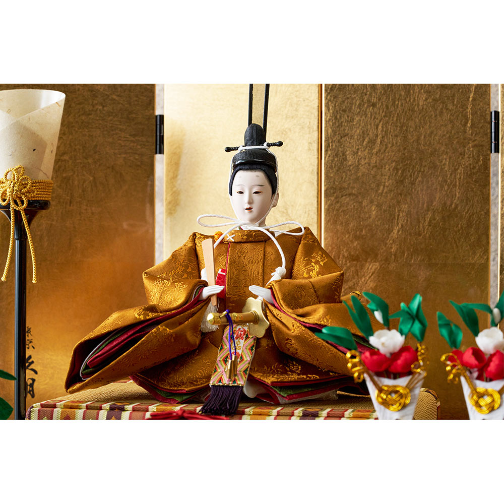 平安装束の中でも格式の高さで知られる黄櫨染御袍(こうろせんのごほう)を再現した男雛と、鮮やかな緑を基調に水色の差し色も素敵な女雛が、伝統技術と匠の手作業によって華麗で優美に表現されています。