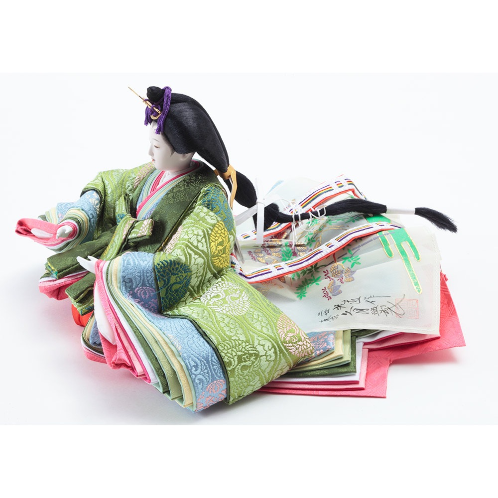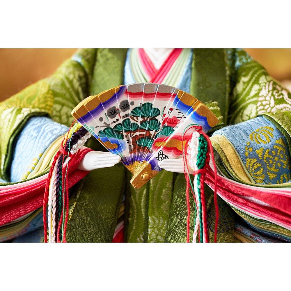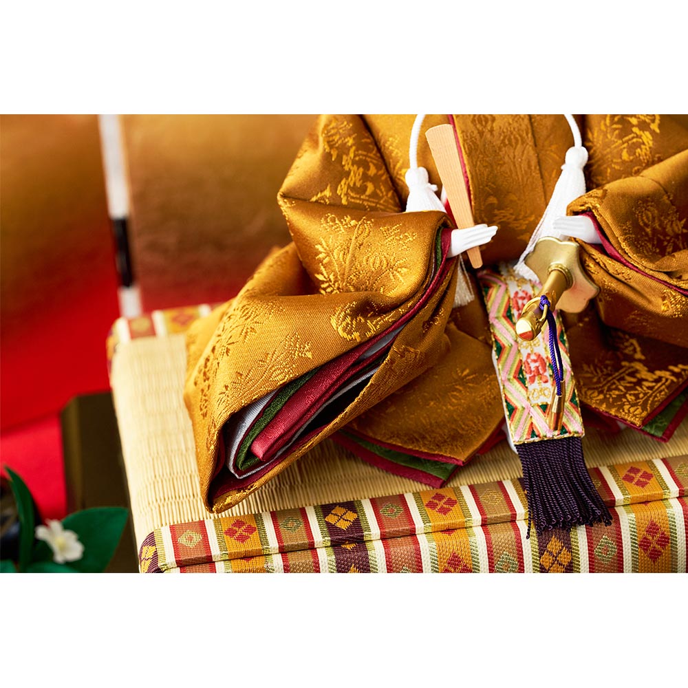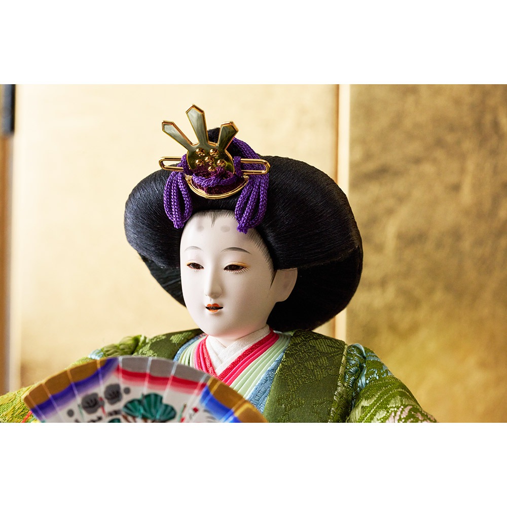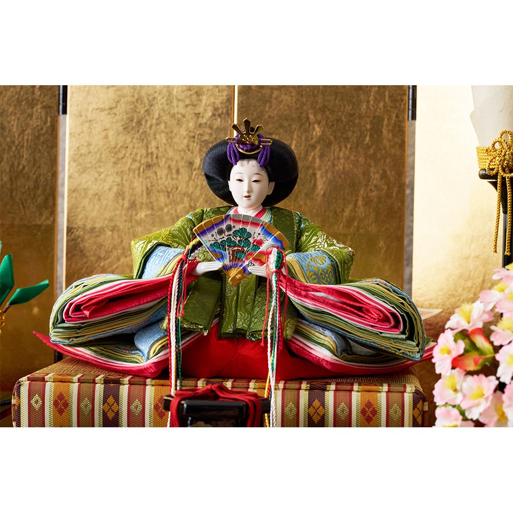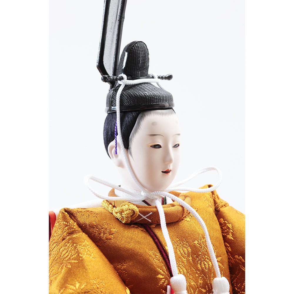 平安装束の中でも格式の高さで知られる黄櫨染御袍(こうろせんのごほう)を再現した男雛と、鮮やかな緑を基調に水色の差し色も素敵な女雛が、伝統技術と匠の手作業によって華麗で優美に表現されています。