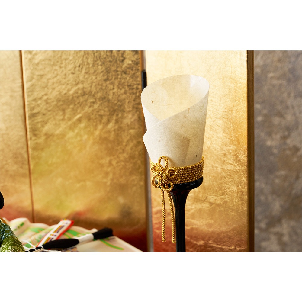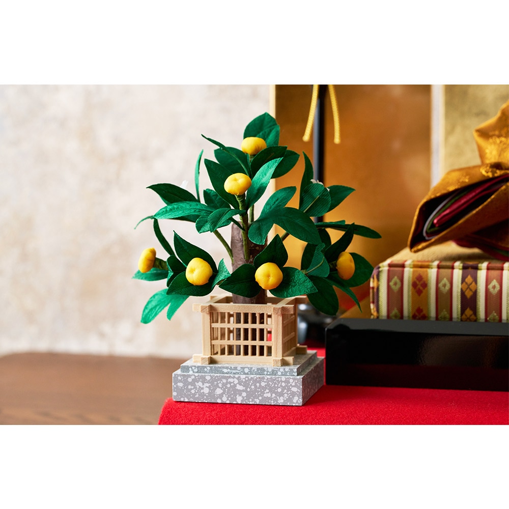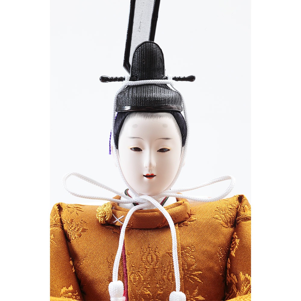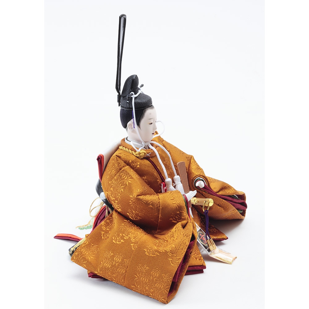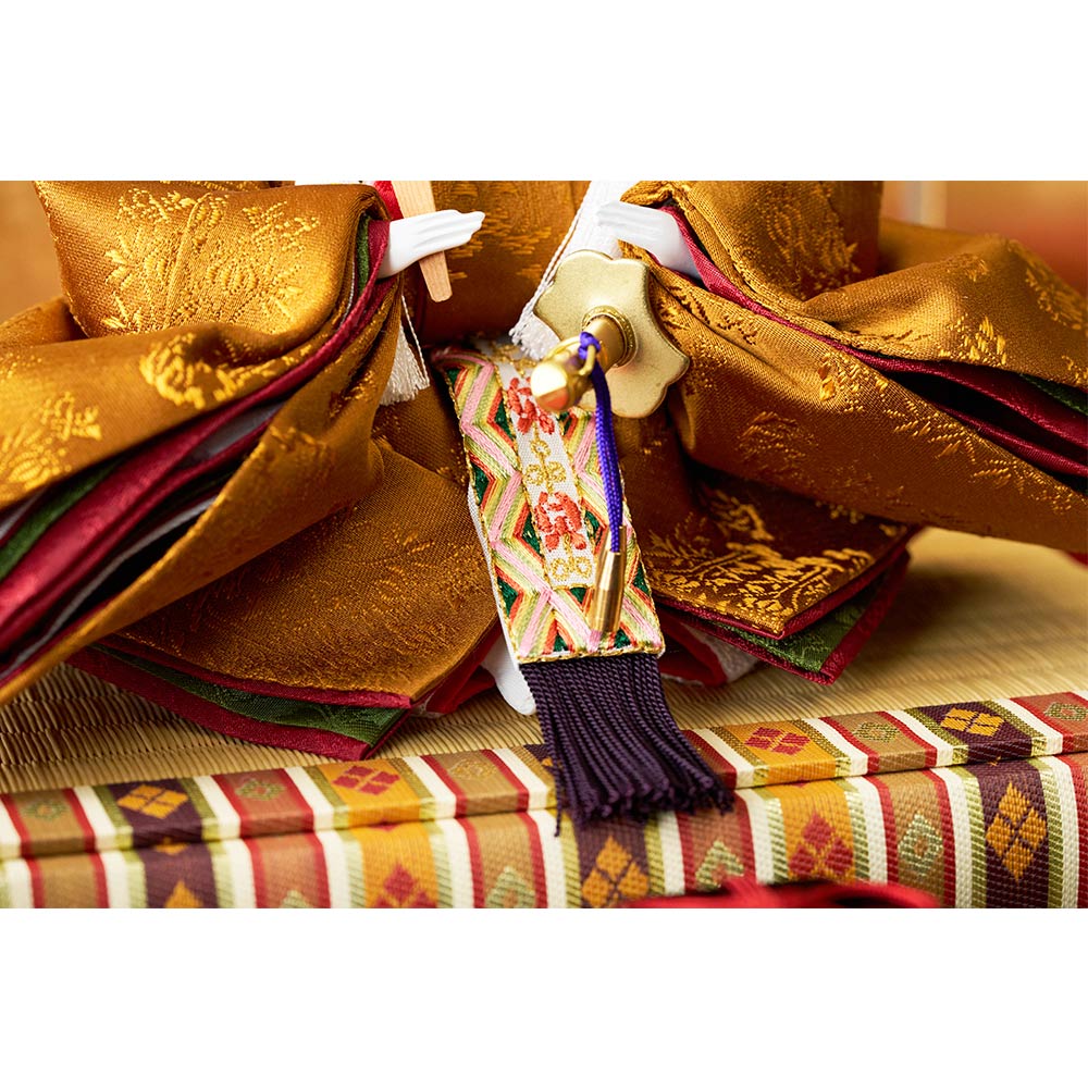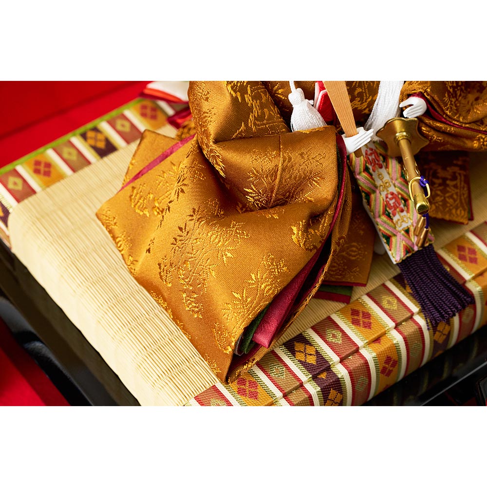 平安装束の中でも格式の高さで知られる黄櫨染御袍(こうろせんのごほう)を再現した男雛と、鮮やかな緑を基調に水色の差し色も素敵な女雛が、伝統技術と匠の手作業によって華麗で優美に表現されています。