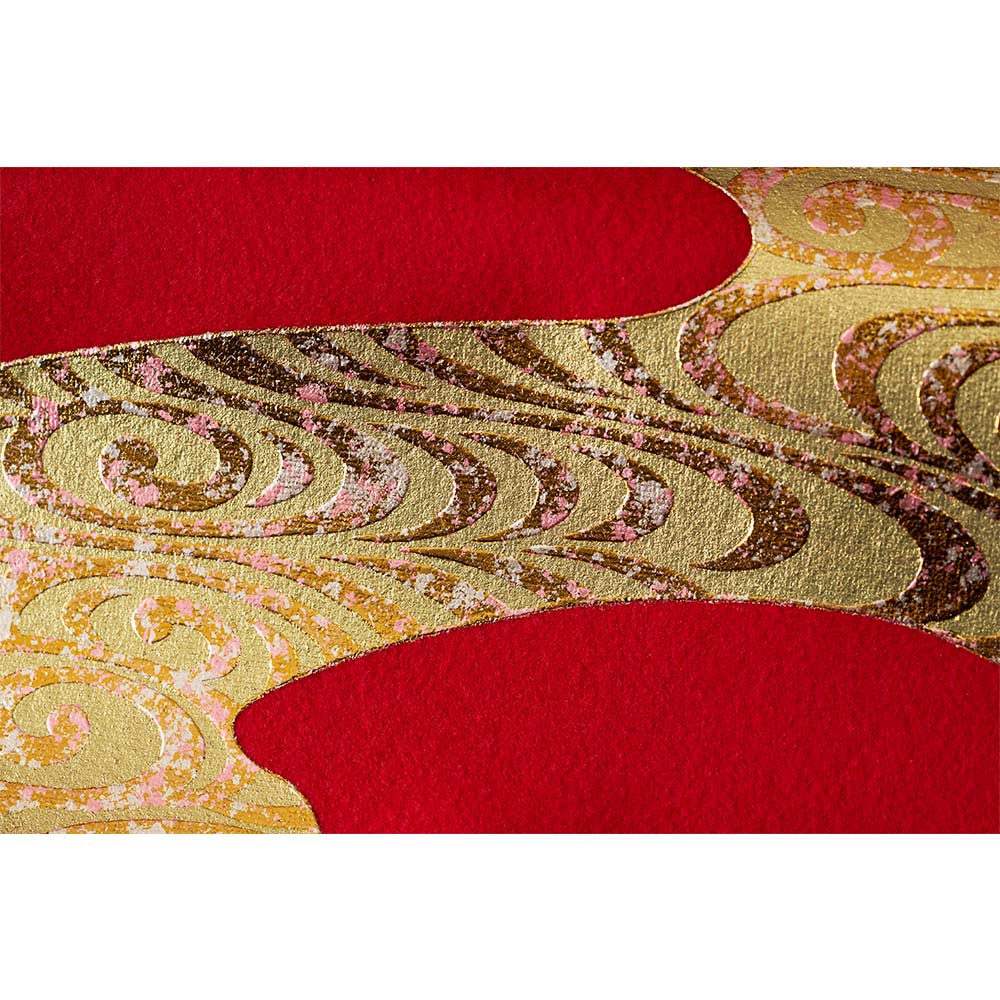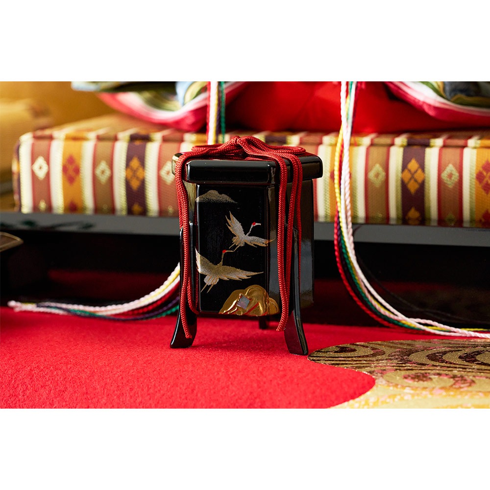 魔除けの意味を持つ赤色の毛氈に美しい絵柄をあしらい、雅で華やかな雰囲気で全体をコーディネートしました。