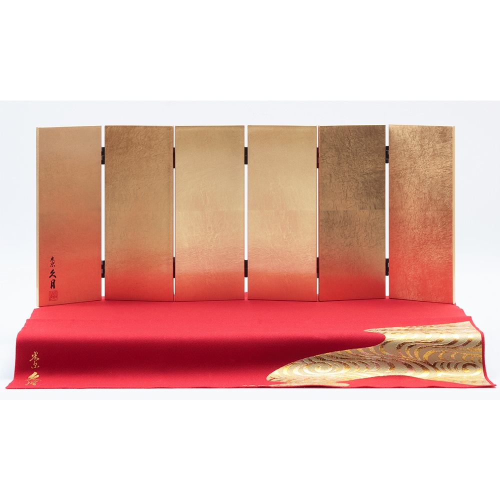 美しい毛氈とクリア塗装を施した上品に光り輝く金箔屏風に、伝統工芸士・二世光匠が丁寧に手作業で仕立てた、優し気に佇むお人形が見事に映えるお飾りです。