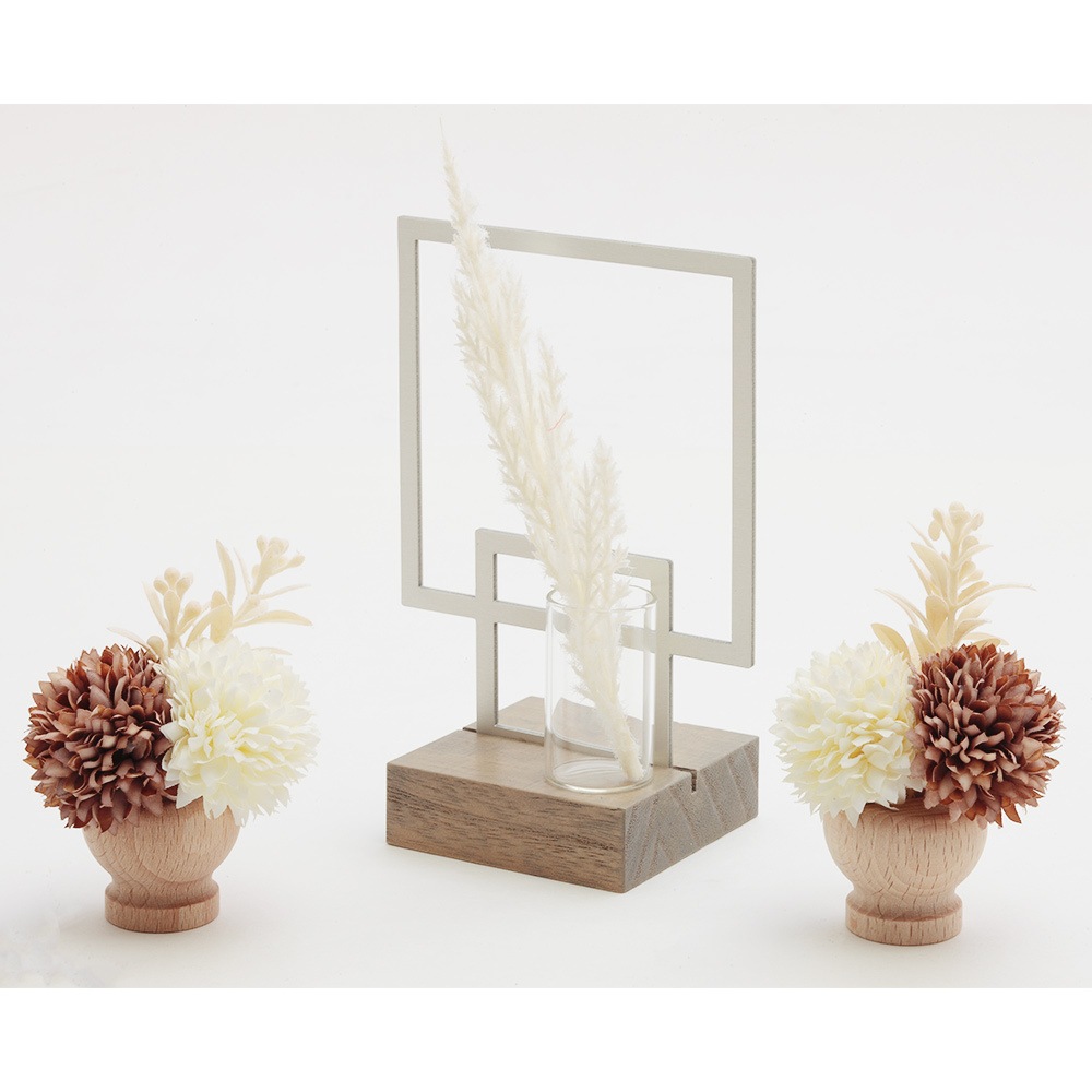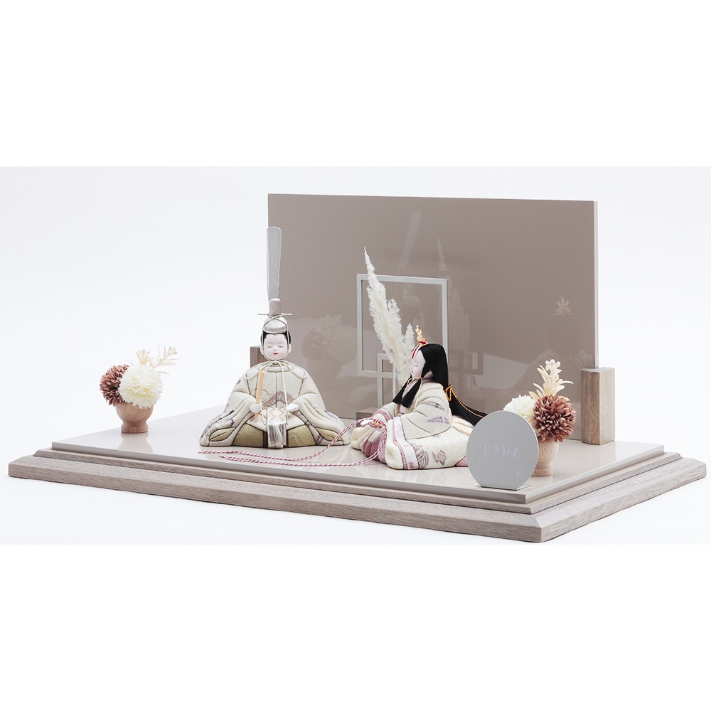 飾り台の中央に配したモダンなテイストの花飾りも、優し気に佇む柔らかな色彩のお人形を一層引き立てます。