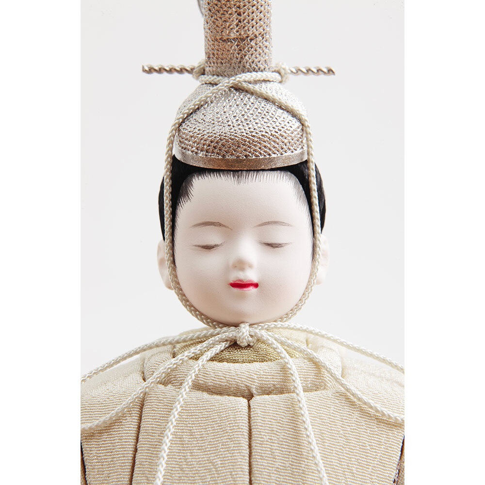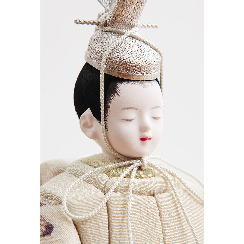 伝統工芸士・木村安子が丁寧に手作業で仕立てた純真なお顔立ちが魅力のお人形が、モカ色のスタイリッシュな飾り台と屏風に見事に映えます。