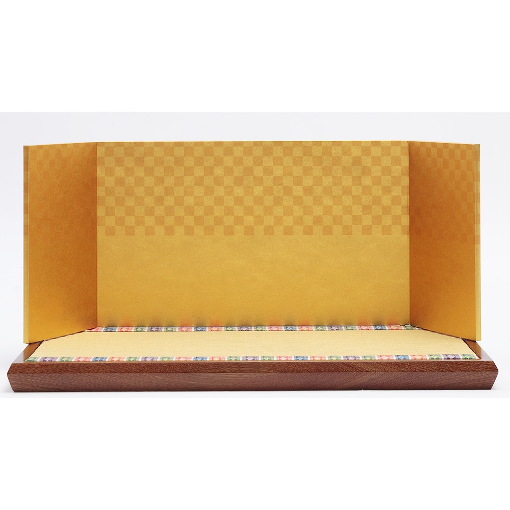 市松模様を表現した趣のあるデザインが素敵な屏風に、愛らしく微笑む優美なお人形が見事に映えます。