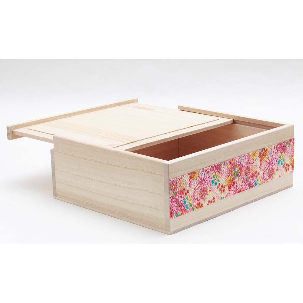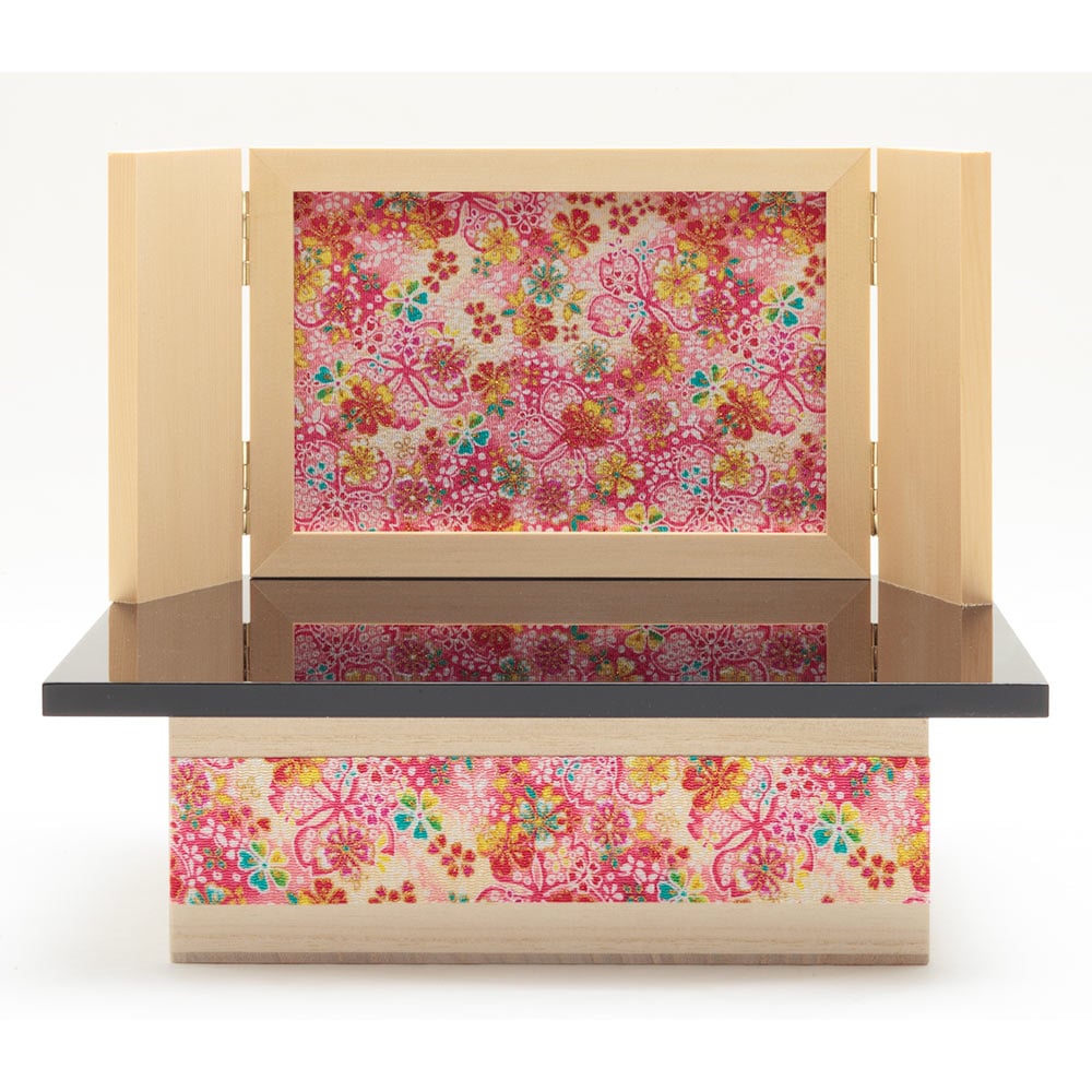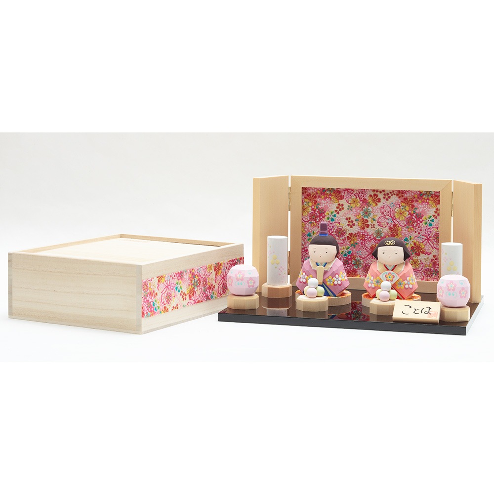 華やかな柄のちりめんを使用した屏風に、一刀彫特有のあたたかみを感じさせるお人形が映えます。