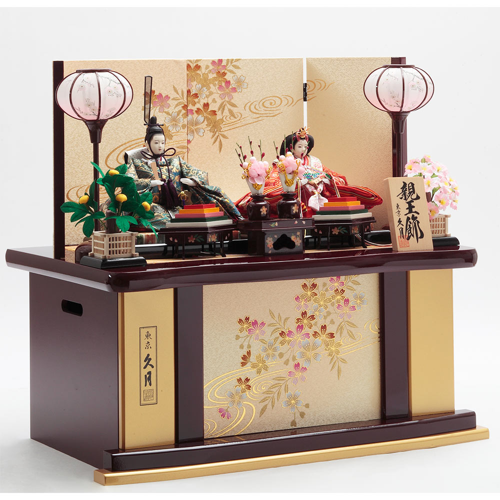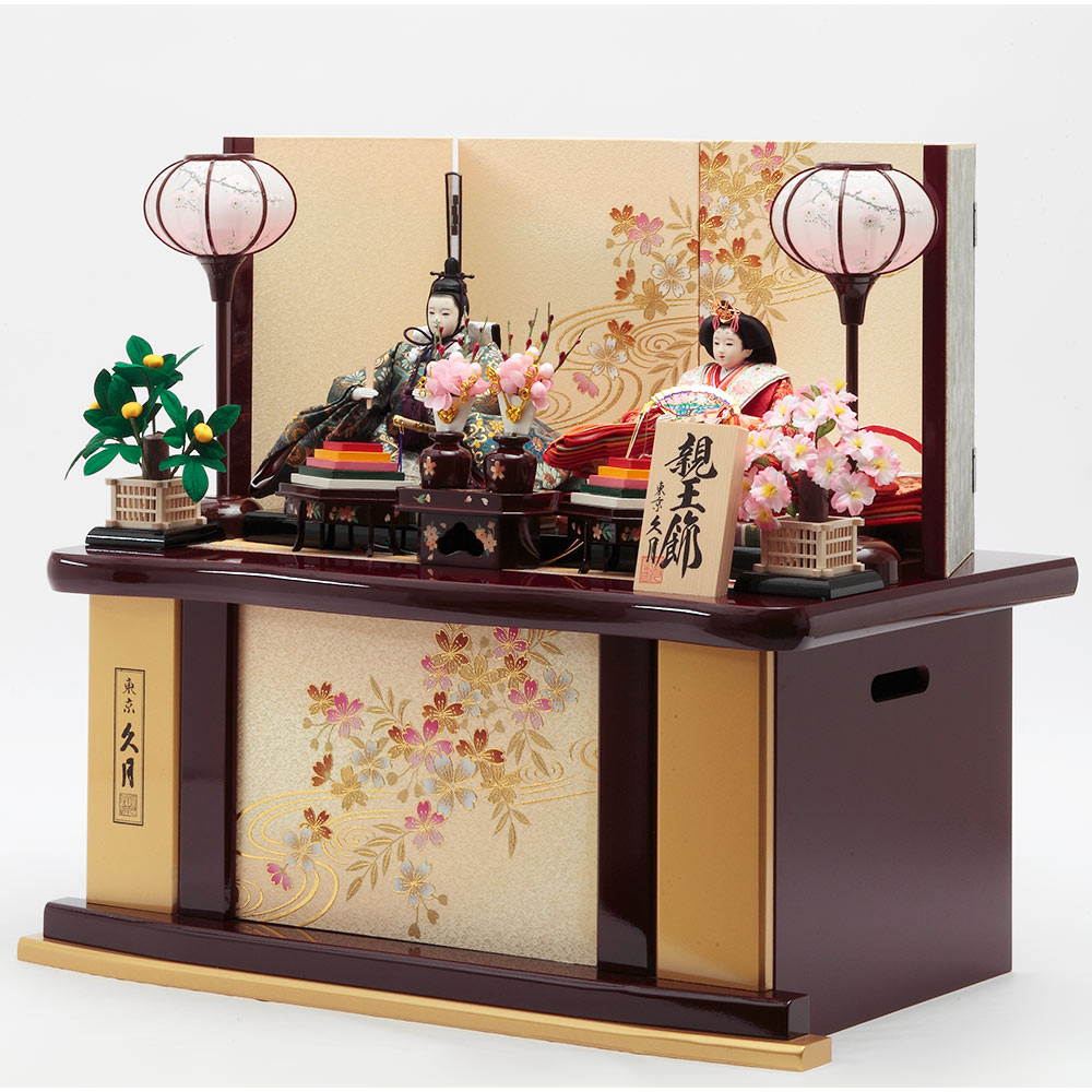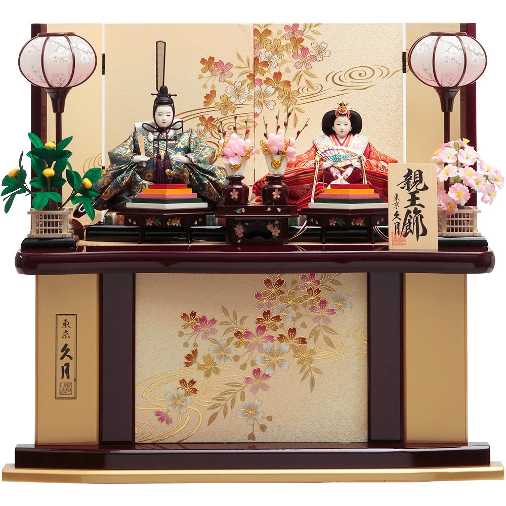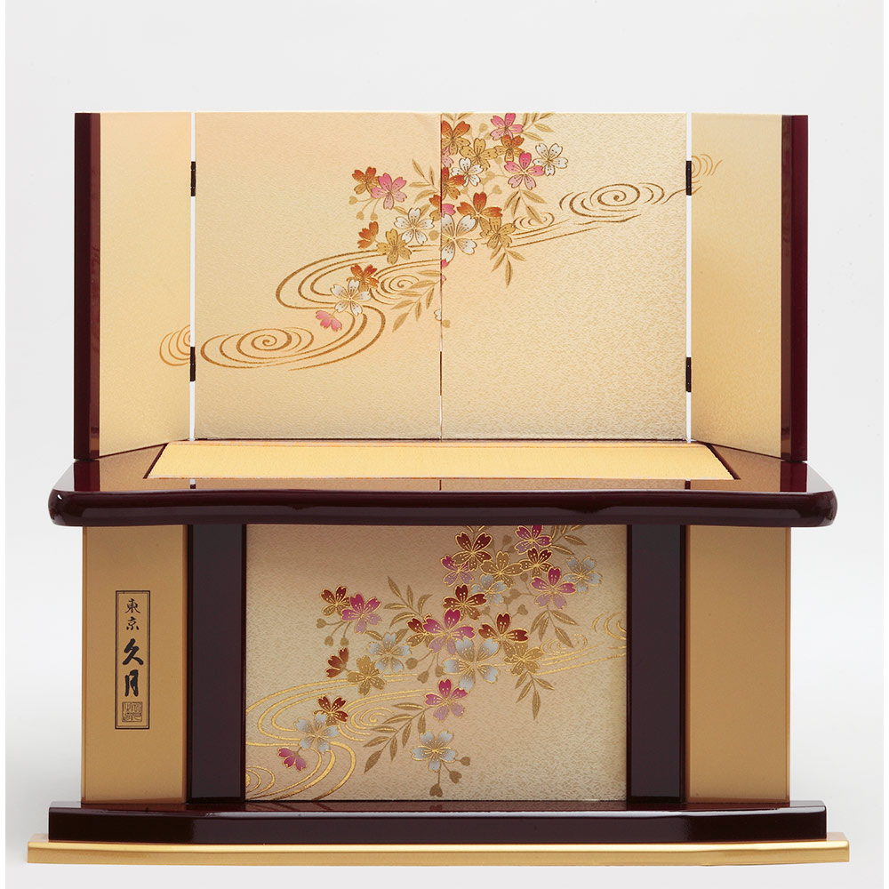 上品な流水桜を描いた趣のある飾り台と屏風に、愛らしく微笑むお人形が美しく調和します。