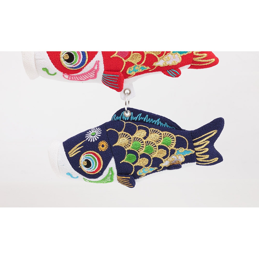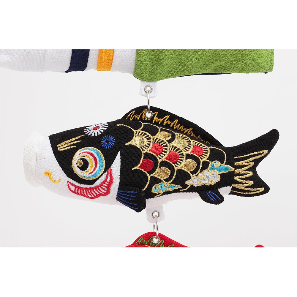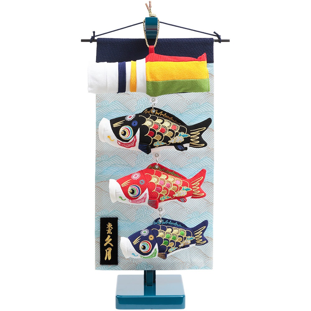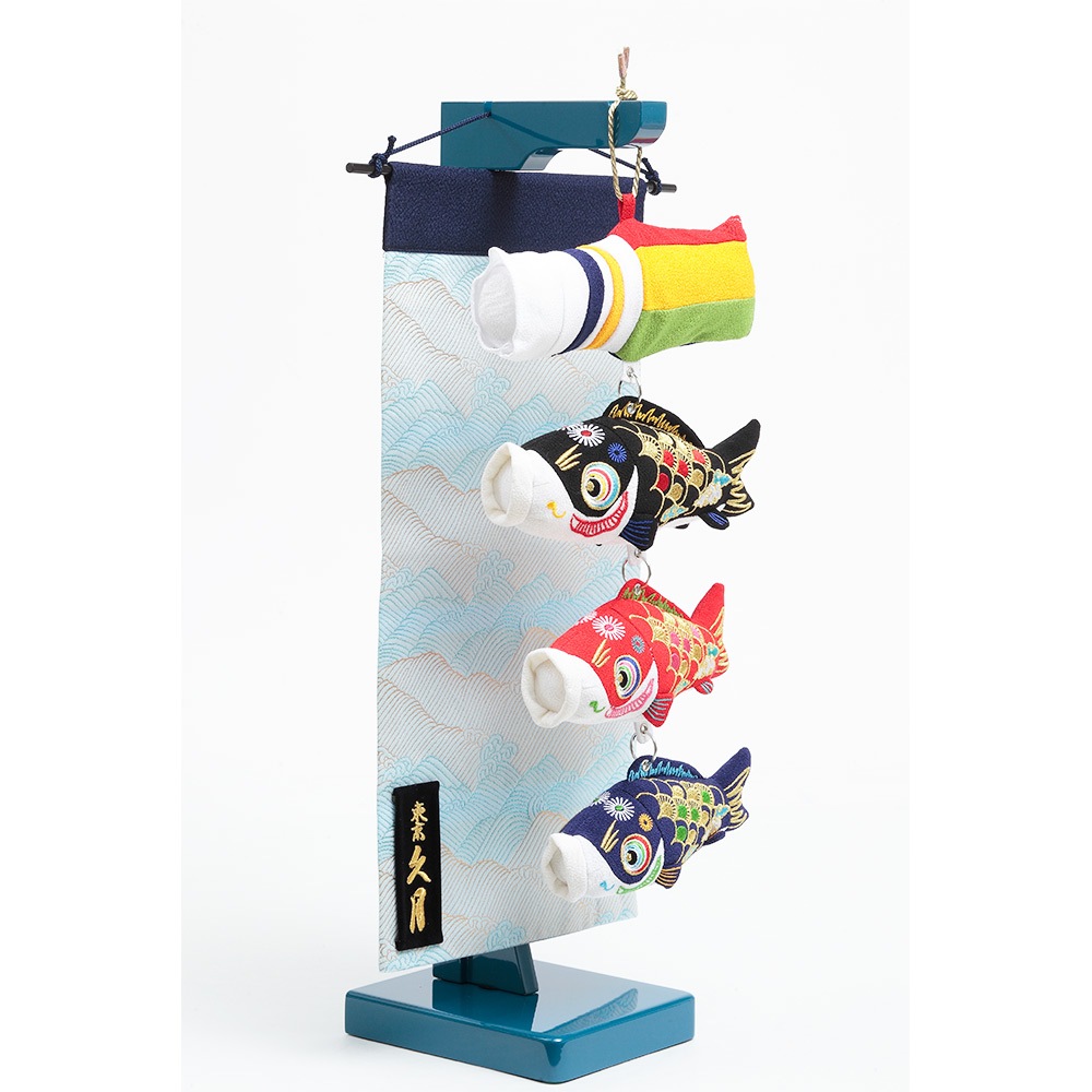 明るく爽やかな色彩の愛らしい鯉のぼりが、永遠や長寿を意味する縁起の良い波頭模様をあしらったタペストリーに見事に映えます。