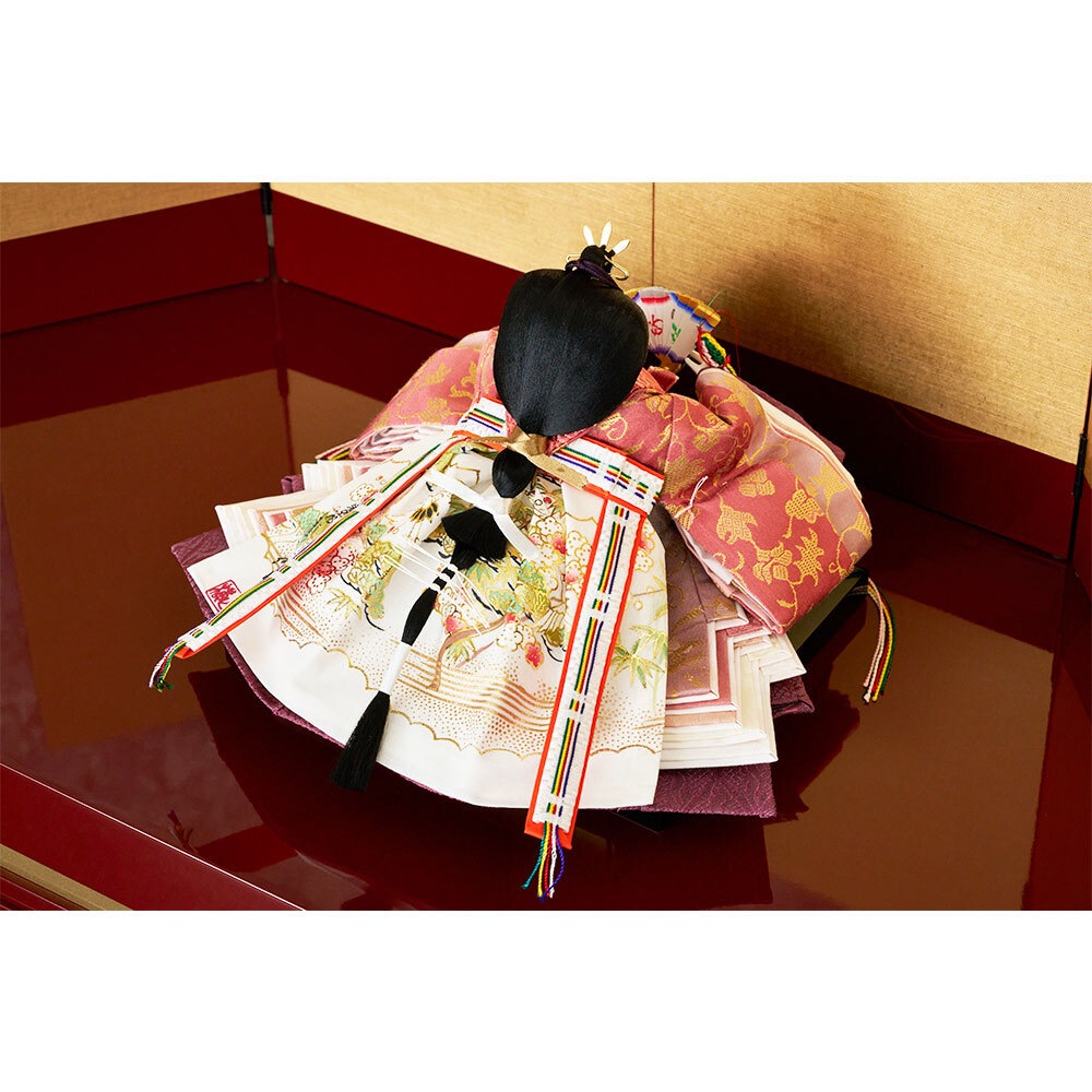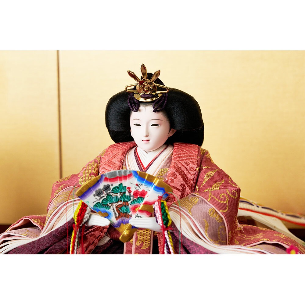 風情のある牡丹唐草文様の衣裳をまとった男雛と、優美な桃色の衣裳をまとった女雛が、高級感のある花梨色の飾り台に見事に映えます。