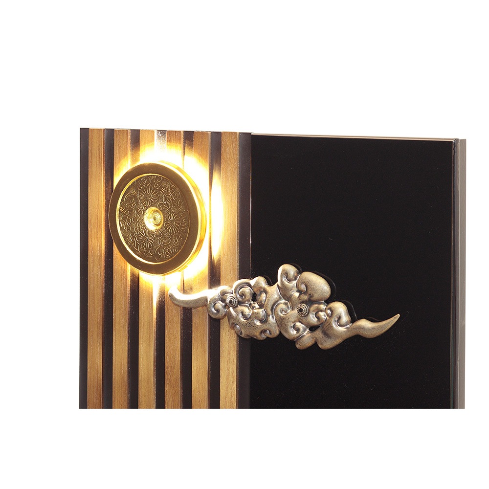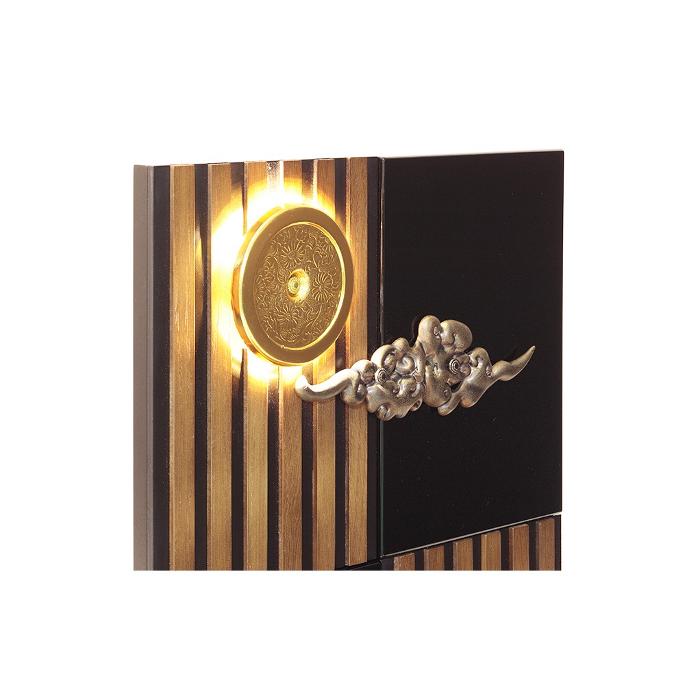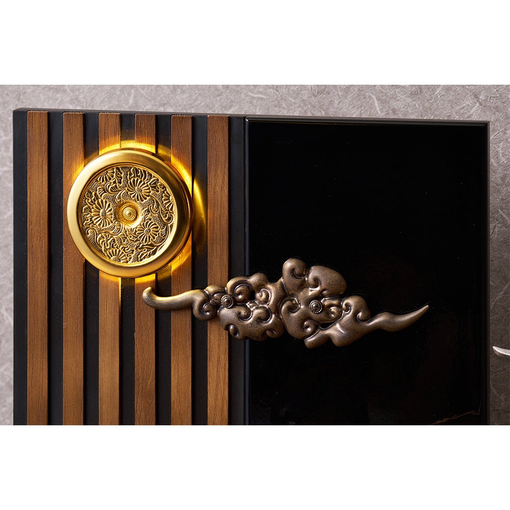 趣のある明かりが灯る仕組みの家紋金具と、印象的な瑞雲の飾り金具を据えた高級感のある衝立式の飾り台に、美しい麒麟と三日月の前立が見事に映えます。