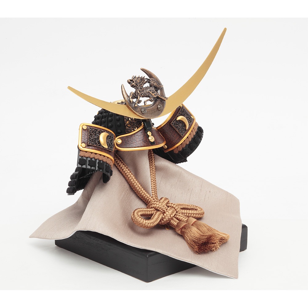 麒麟児は才知に優れた少年の例えで、その吉祥にちなみ"お子様が才知に優れた逞しい少年に育つように"との願いを込めて、兜の前立に縁起の良い麒麟の飾り金具をあしらった人気のお飾りです。