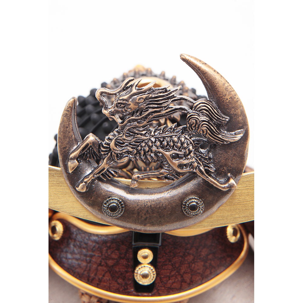 兜の吹き返し部分にあしらった三日月金具の装飾も、全体の統一感を見事に高める、縁起の良い麒麟のモチーフに魅せられるお飾りです。