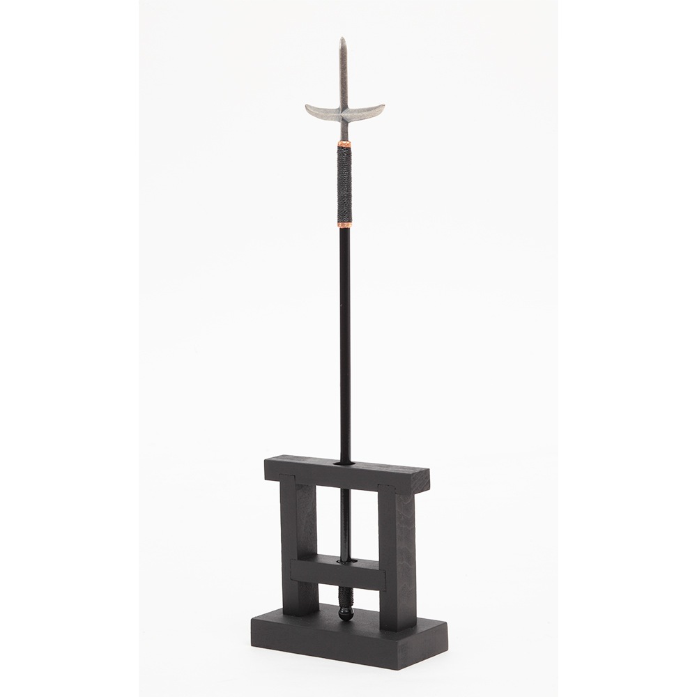 上品な木肌が素敵な木目調の飾り台には、身を守る意味を持つ十文字槍を配した、男の子のお祝いに相応しい勇壮なデザインも特長です。