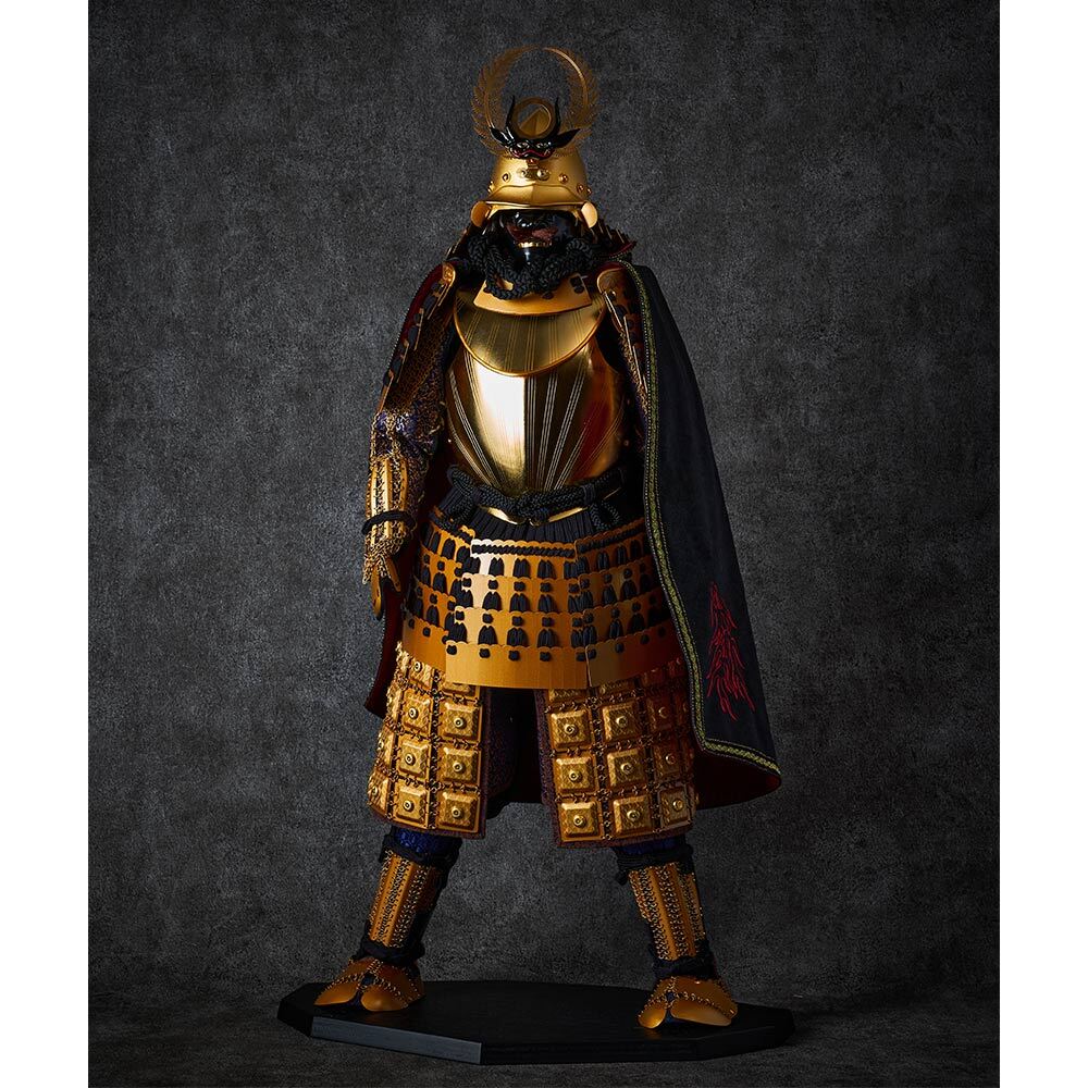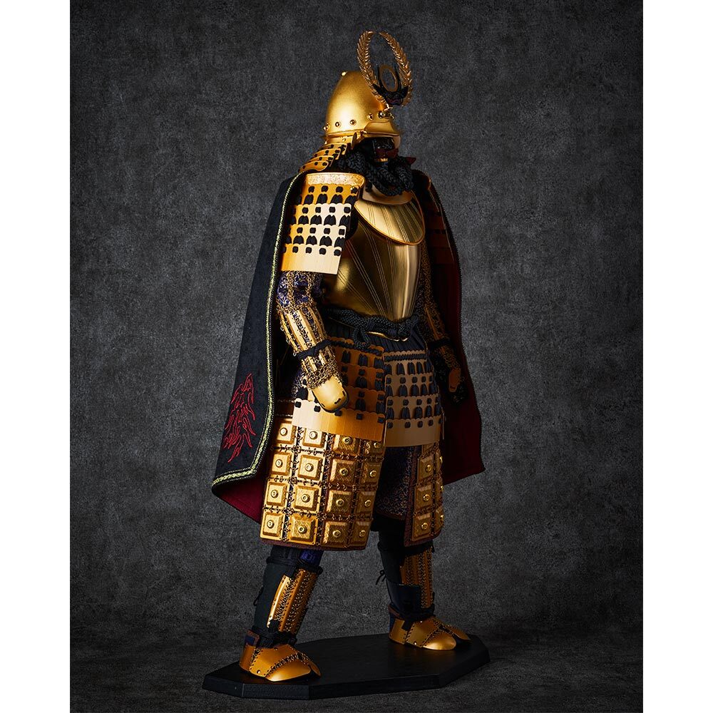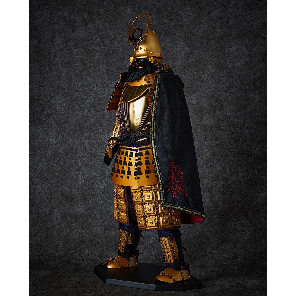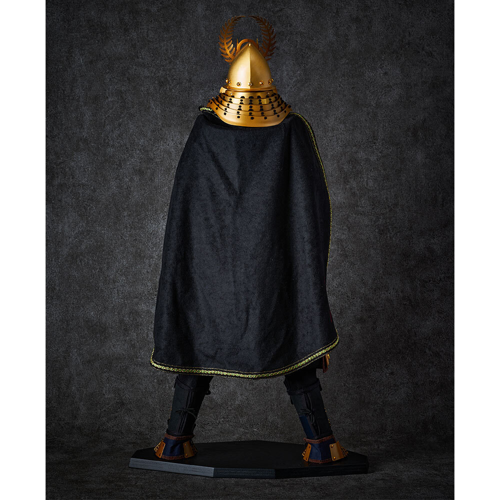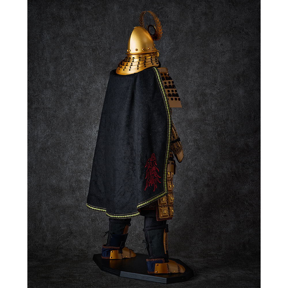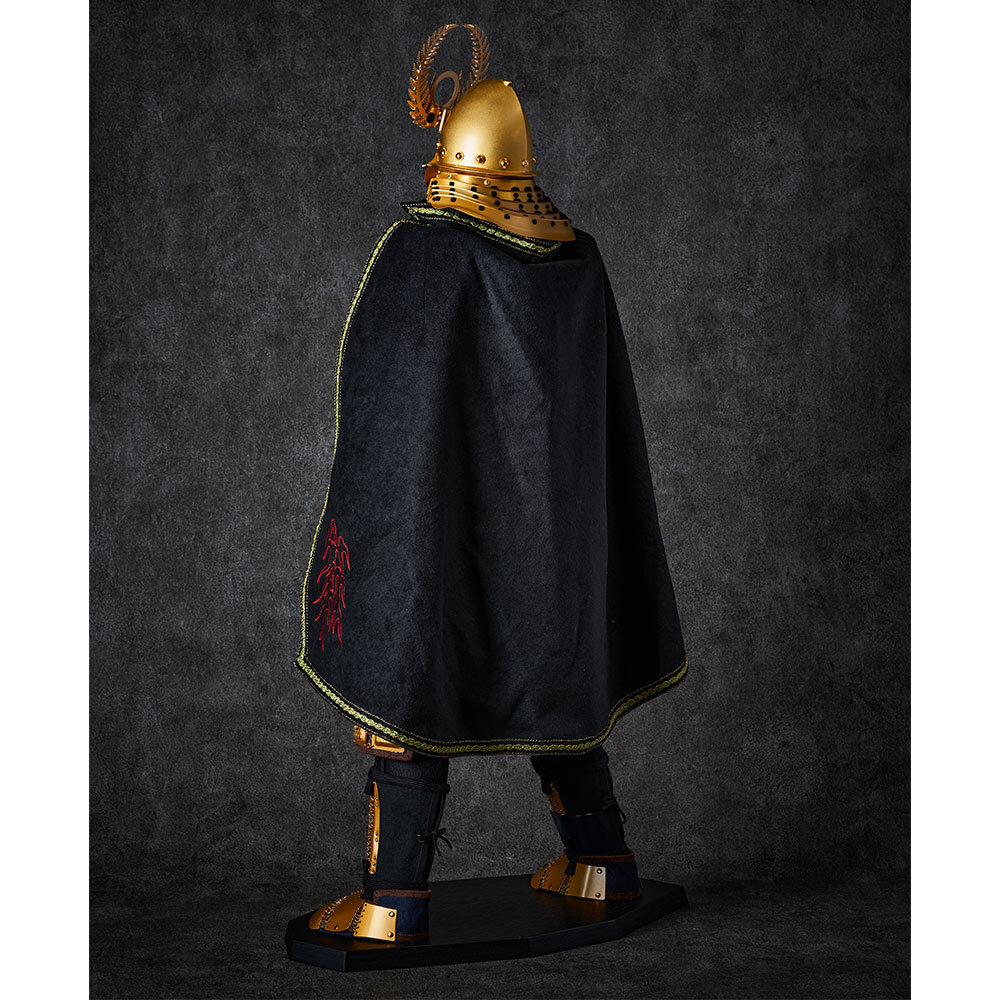 西洋の雰囲気を醸し出す、漆黒のマントを着せた南蛮甲冑ならではの仕立ても、勇壮な立ち姿を一層引き立てます。
