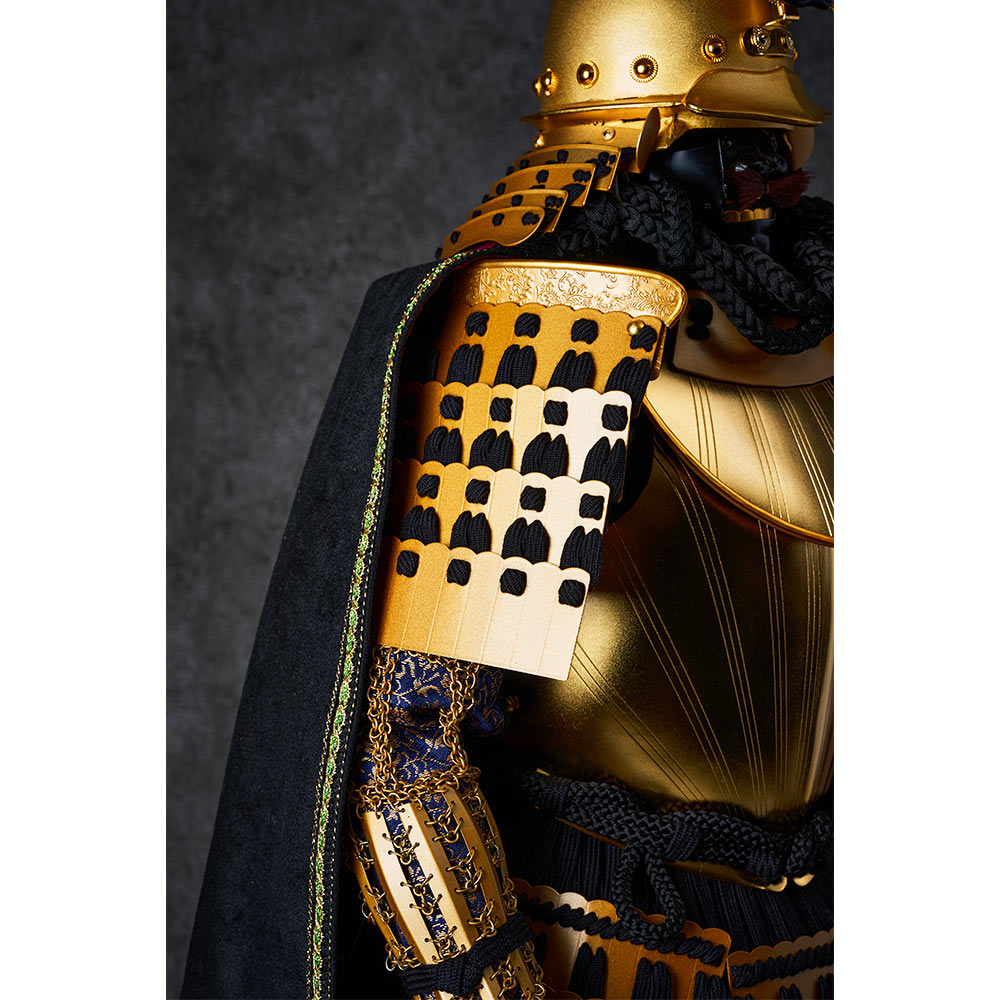 上品な正絹の黒糸縅(くろいとおどし)を素懸で仕上げた黄金色に輝く南蛮甲冑に、子孫繁栄を意味するシダの葉を象った美しい歯朶前立が見事に映えます。