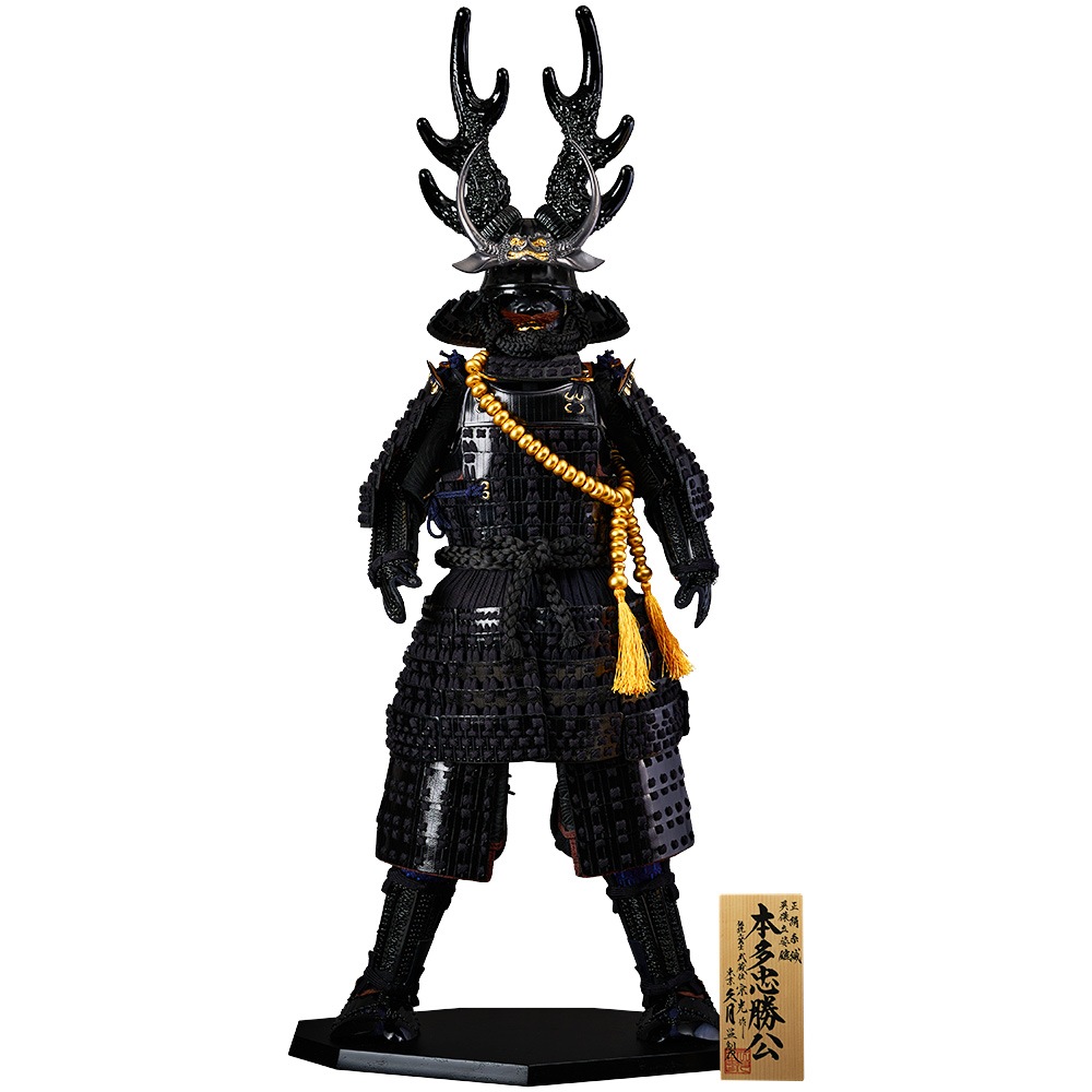 徳川四天王の一人として名を馳せた古今独歩の勇士・本多忠勝公で有名な、鹿角脇立をあしらった漆黒の鎧を、勇壮な立ち姿で表現した人気の英傑立姿鎧飾りです。