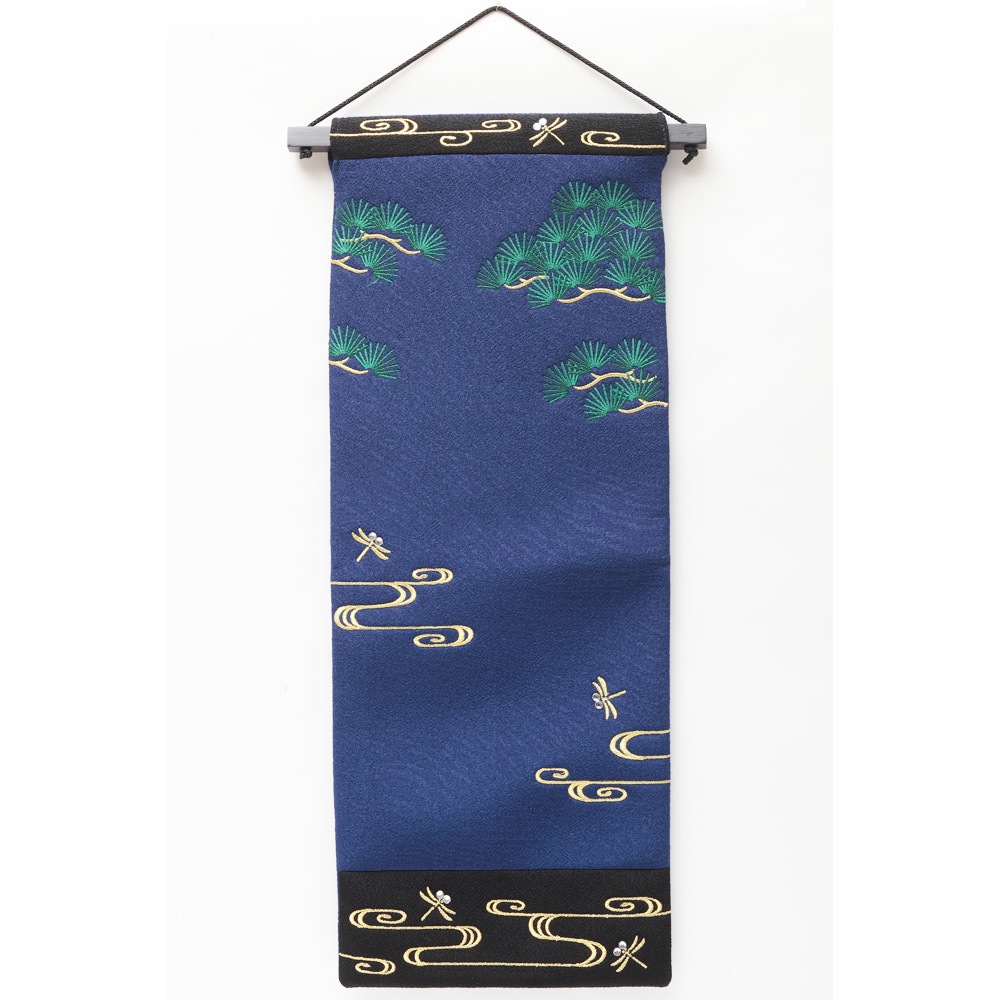 鯉のぼりを引き立てるタペストリーには、松と流水文様が描かれています。