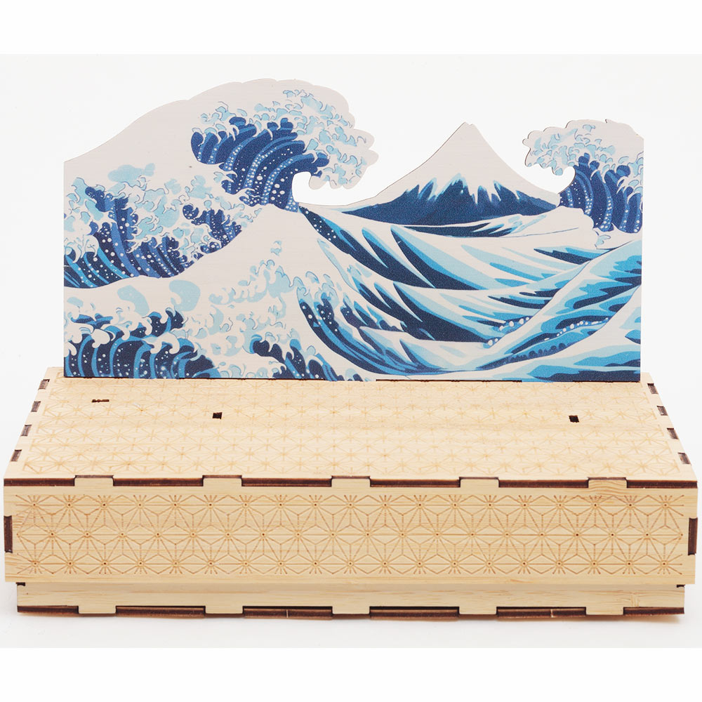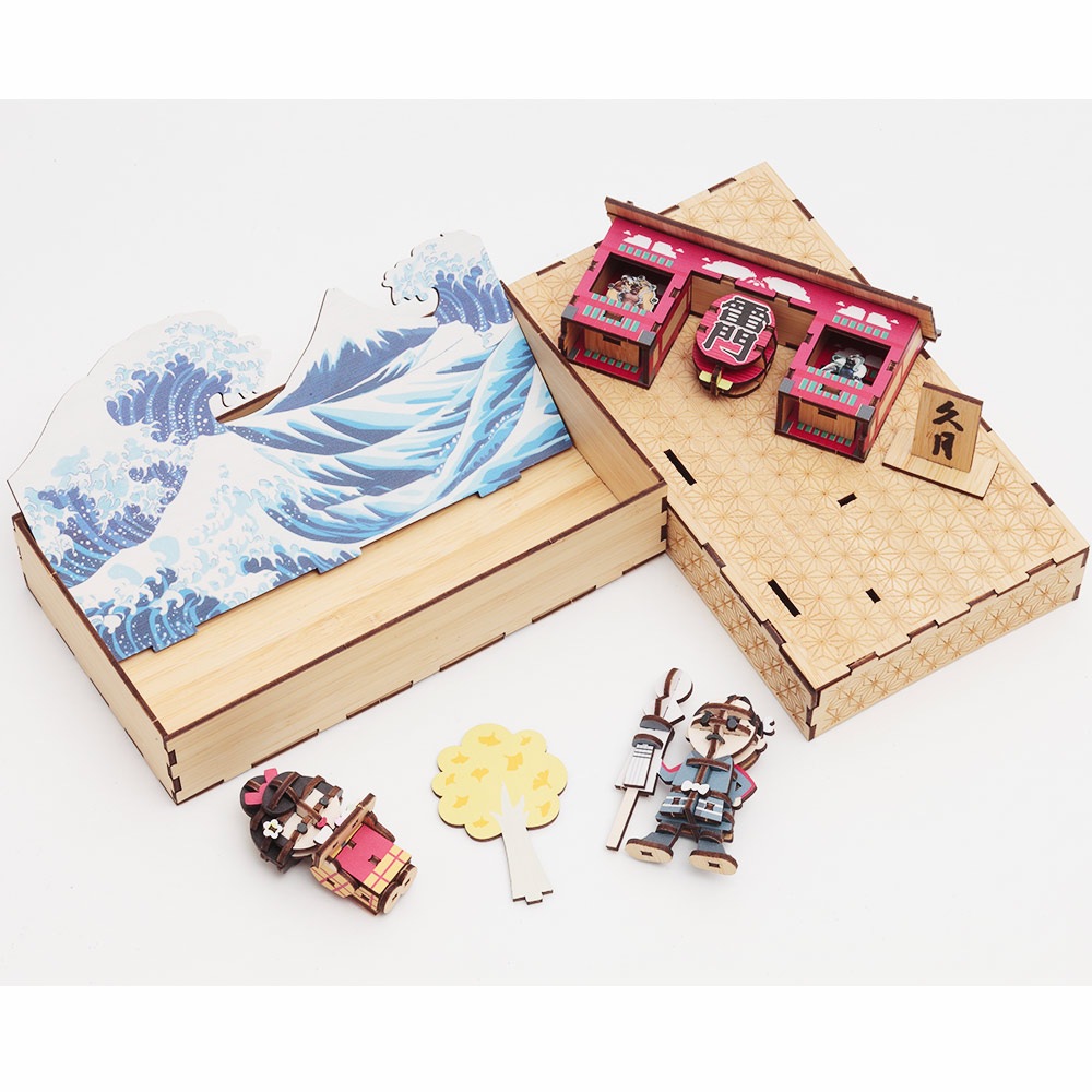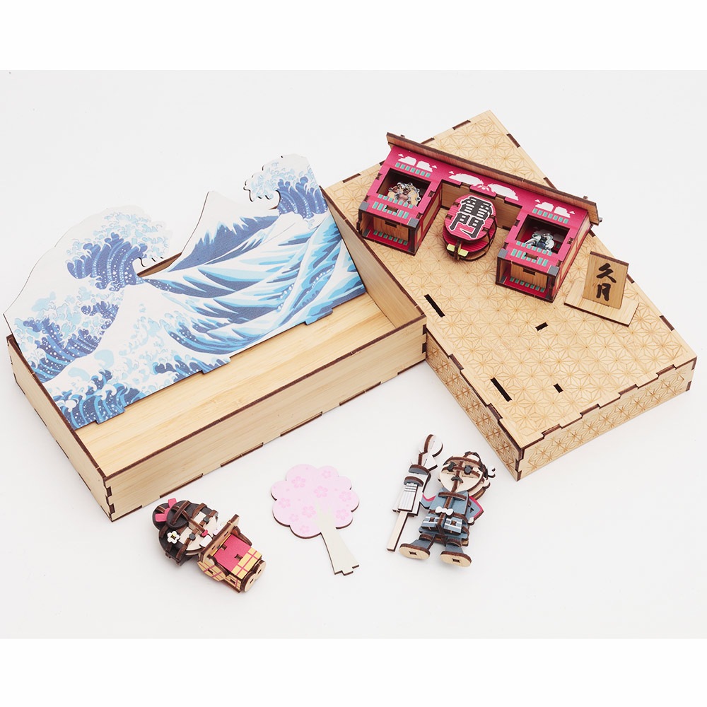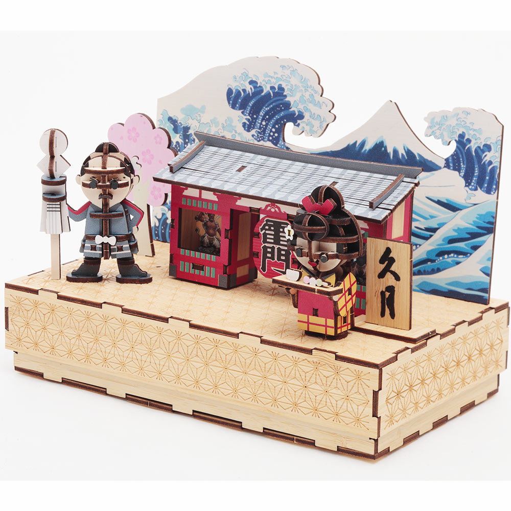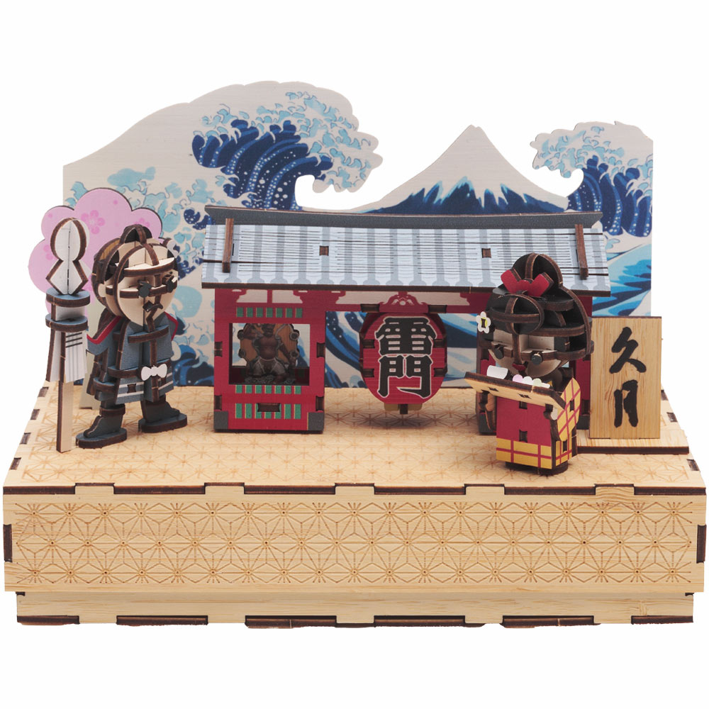 江戸を思わせる雷門、富士山と波のパーツが目を引く手軽に組み立てられる竹製のパズルです。