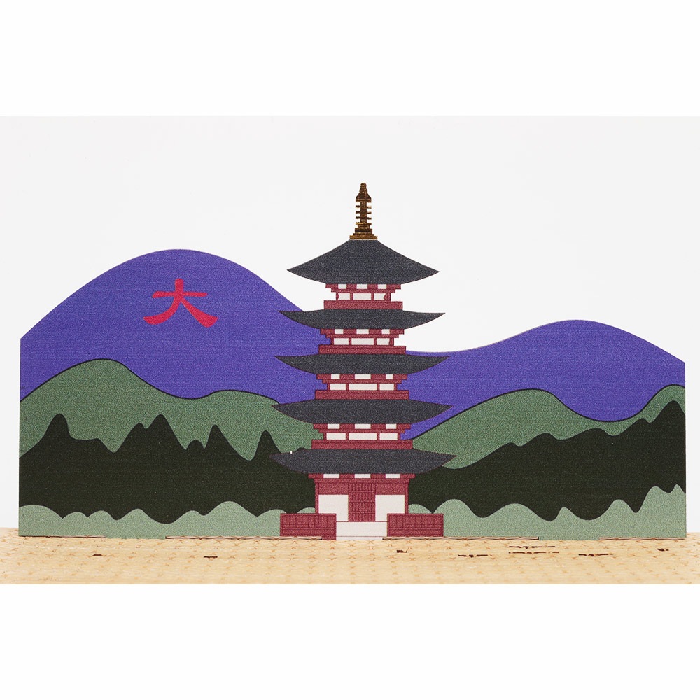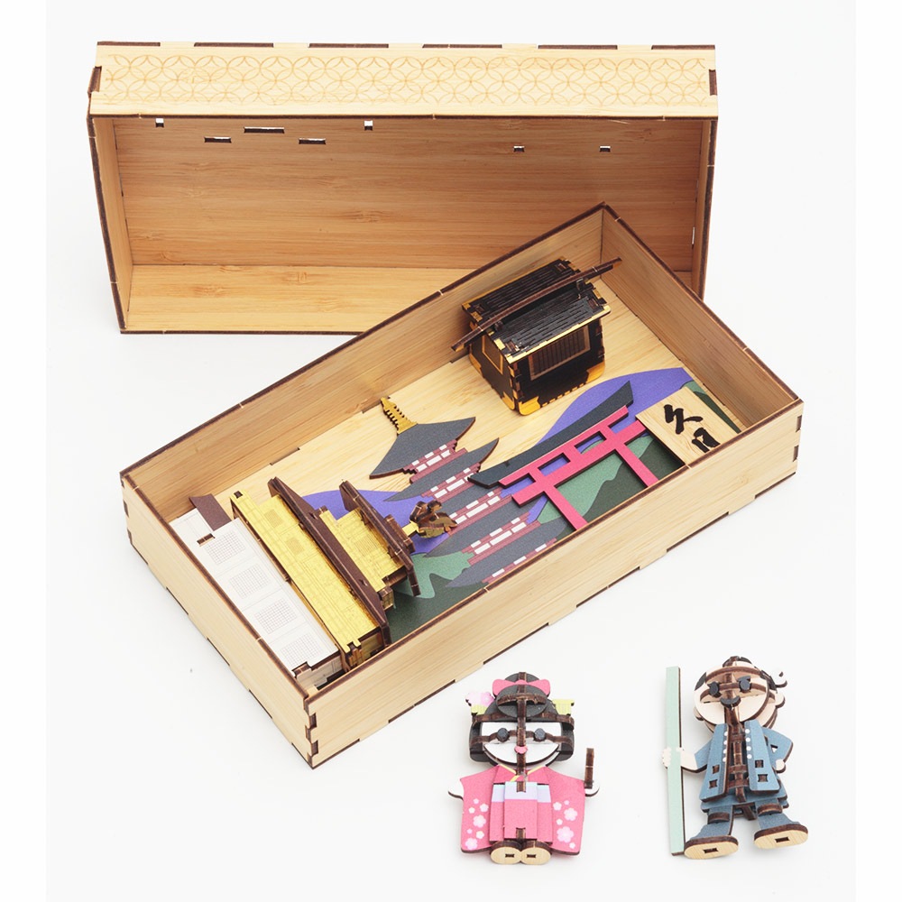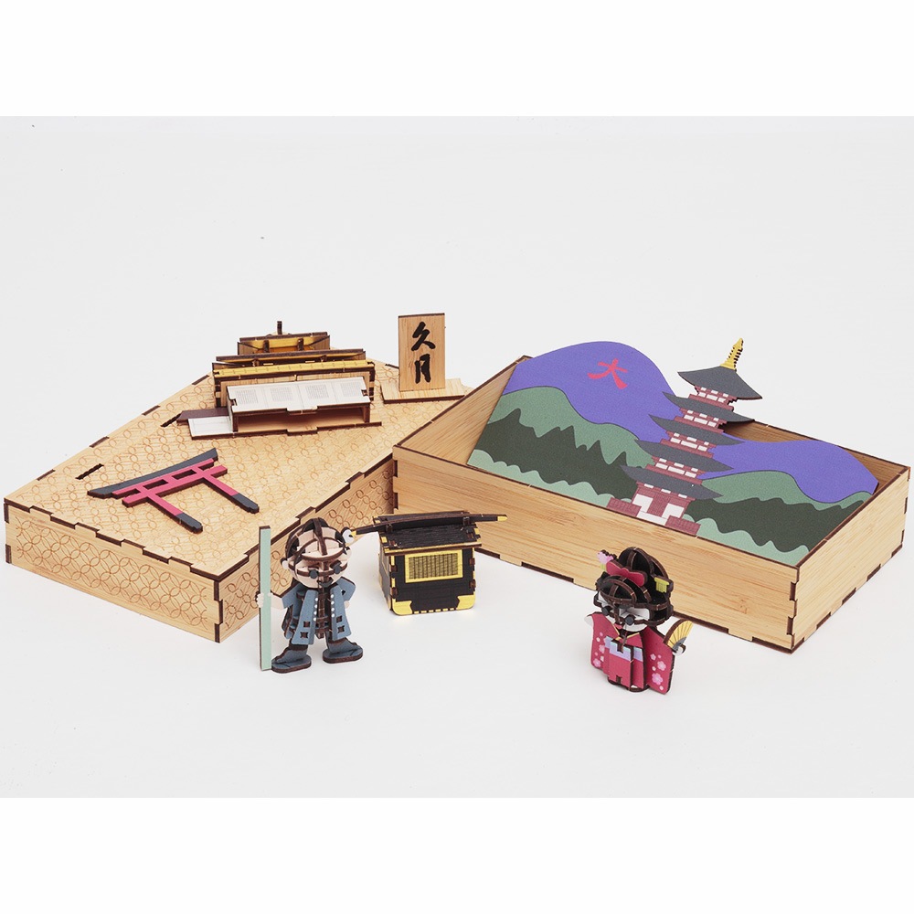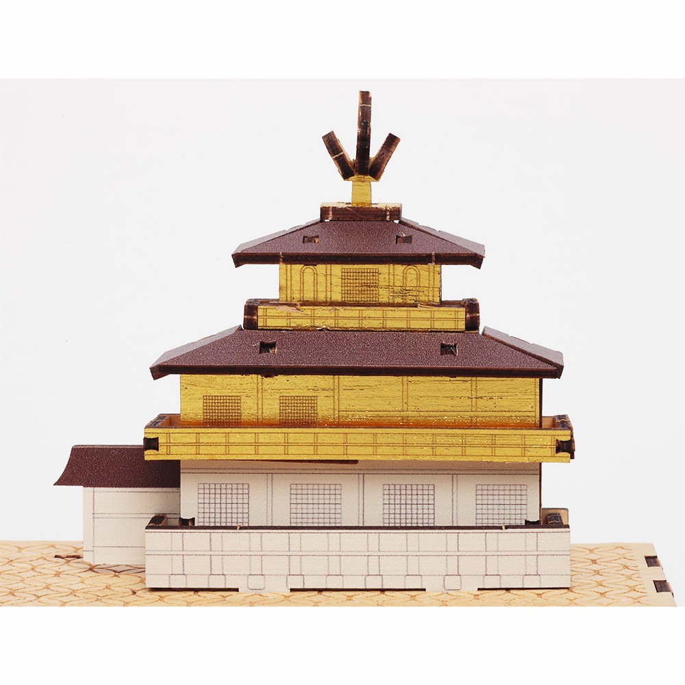 京都を思わせる金閣寺や五重塔のパーツが目を引く手軽に組み立てられる竹製のパズルです。